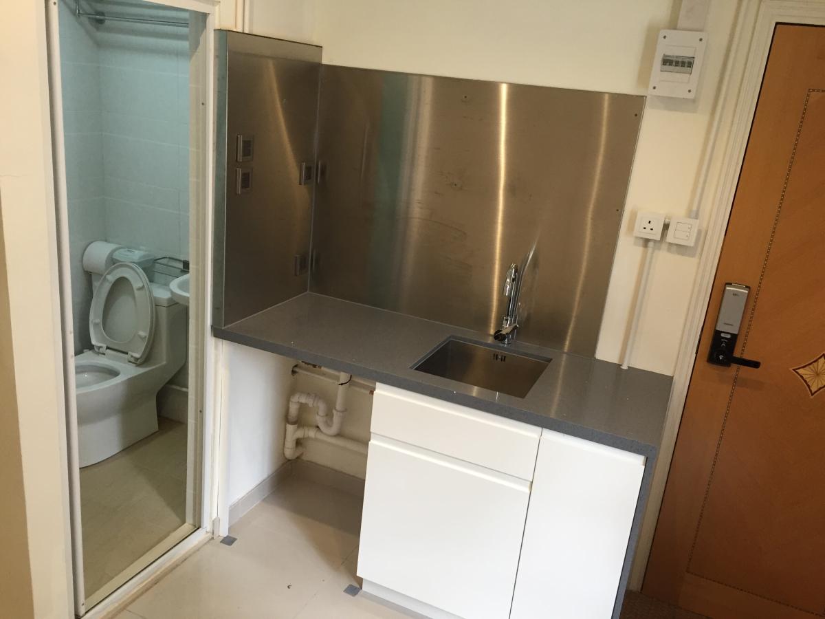 百餘呎的套房「一眼睇曬」,其中,廚房採開放式間隔,代理指手洗盆旁的位置可擺放爐具,可採明火煮食,業主為減低火災風險,廚房兩旁的牆身採月用了不銹鋼物料。不過附近位置亦設有4個電掣,相信單位內明火煮食亦存在安全隱患。據代理指,業主不住上址,但其餘6間套房均以租出,租客以年輕夫婦或情侶為主。