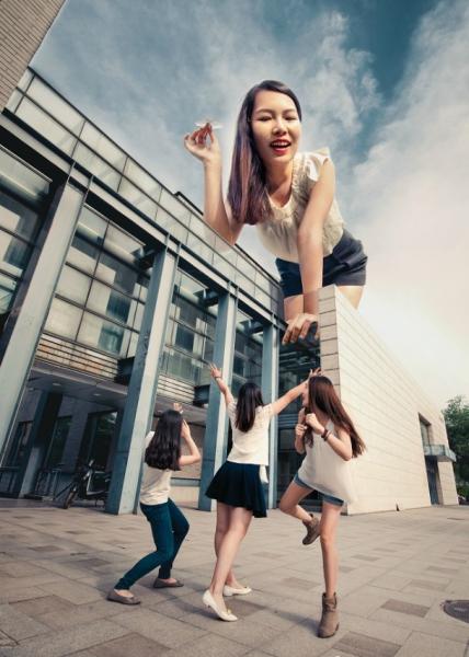 負責拍攝和後期製作照片的北大畢業生呂宸表示,為了要呈現的「巨人」與「人」在體型上的強烈對比,首先要先將人物和場景分開拍攝,之後在後期製作時把人放大與場景結合。「要讓照片看起來真實,這就需要光線和角度的完全一致。 」呂宸說,就連人物的影子也是一筆筆畫出來的。