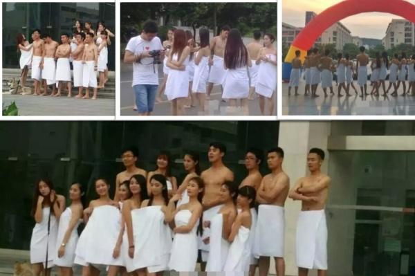 據網上流傳的照片顯示,不論男、女畢業生都是赤腳,全身只有一條白色浴巾包裹重要部位,而男生更是半祼。