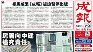 《成報》今日電子版頭版刊登「特訊」,指《成報》母公司的臨時清盤人畢馬威會計師事務所輕率處理事件,拖累成報今日被迫暫停出版。