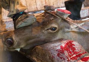 每年收割鹿角的時候,人們會把飼養的馬拉赤鹿趕進專門的「割角室」。在那裡,可憐的馬拉赤鹿被固定在一個特製的木槽中,四腳懸空不能動彈,身體還被一擁而上的四五個人牢牢控制。隨後,在不使用任何麻醉藥的情況下,馬拉赤鹿的鹿角被電鋸齊根切下,猩紅的鮮血從切口飛濺到一旁的木槽邊。為了方便切割鹿角,人們甚至直接用腳踩在鹿的頭上,而鹿眼中流露出來的驚恐和血淋淋的傷口更是觸目驚心。最後,馬拉赤鹿的鹿角切口上會被灑上一種凝血的粉末,幫助其恢復。