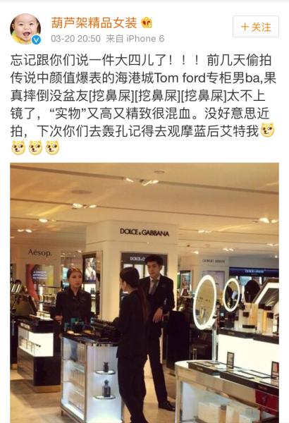 海港城一名叫Kennith的化妝品專櫃男sales最近紅遍內地微博,該sales外形俊朗,身材高大,有女網民購物後偷拍並將照片上傳,引來不少內地女網民紛紛表示要來海港城該專櫃消費,有人大讚他是「海港城古天樂」。
