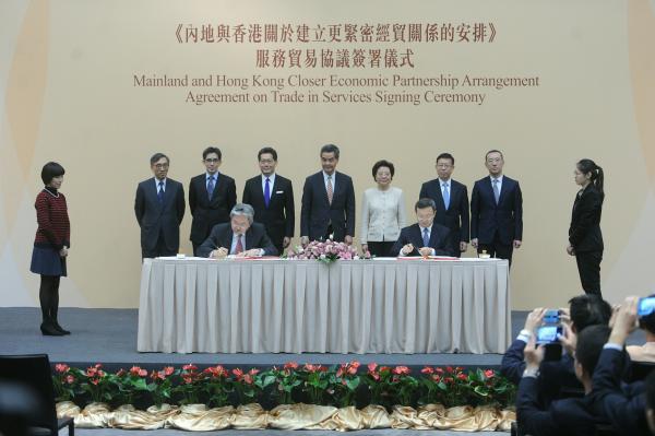 曾俊華與王受文在行政長官梁振英和中聯辦副主任仇鴻等人見證下,簽署有關協議。曾俊華致辭時形容,今次簽訂服務協議,為內地和香港持續開放服務貿易,達至新的里程碑。