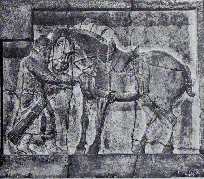 身穿馬具的颯露紫,其左為丘行恭,攝於1920年,現藏於賓夕法尼亞大學考古學與人類博物館