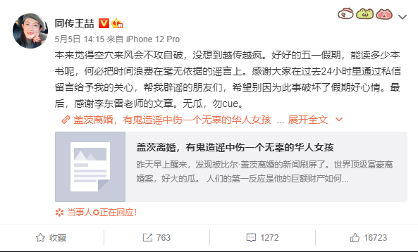 對此,王喆於5月5日在其微博發文稱:「本來覺得空穴來風會不攻自破,沒想到越傳越瘋。好好的五一假期,能讀多少本書呢,何必把時間浪費在毫無依據的謠言上。感謝大家在過去24小時裡通過私信留言給予我的關心,幫我闢謠的朋友們。」