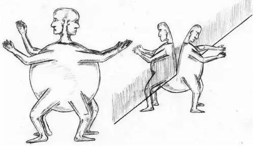 其靈感源於柏拉圖的《會飲篇》中,假托阿里斯托芬Aristophanes之口提出「圓球人」的理念:最早的人類是球形,由四條胳膊、四條腿、一個頭、兩張臉組成,朝向相反方向。球形人類具有非凡力量和智慧與諸神戰鬥,後被神祇劈鑿成兩半,以削減他們的力量。從此以後,這些最初的球形人類變成了獨立的兩半——走失,尋找,重逢。所以人終其一生都在尋找另一半的自己,故,我遇見我,我殺戮我,我愛我,我是我。
