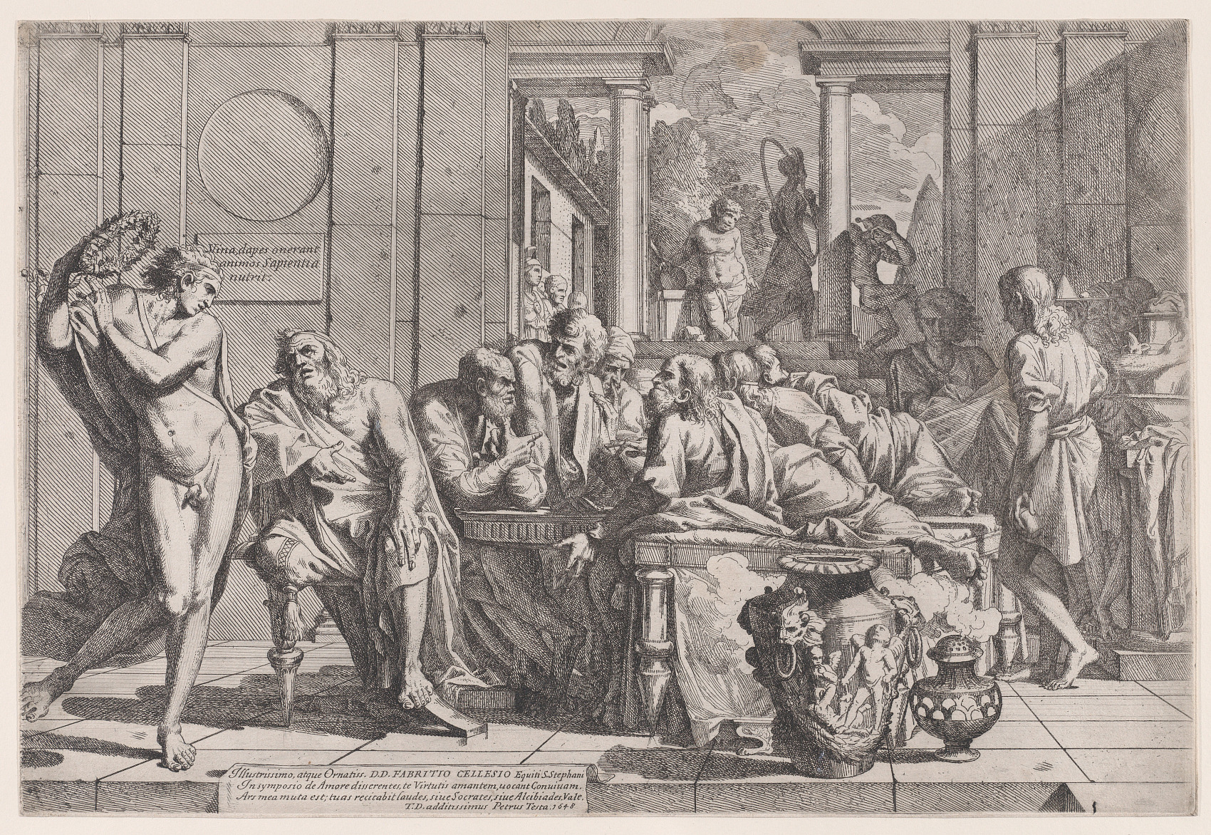 《會飲篇》(或譯作《饗宴篇》、《宴話篇》)是柏拉圖早期的一篇對話式作品,它描述了在一次宴會上,一群雅典男性對愛的本質進行討論。該作品以演講和對話的形式寫成,既有諷刺式的,也有認真的對談。他們對話的大前提是(而且有些講者更清楚說明),最高貴的愛是男人之間的愛。愛是對美的期盼,美貌、智慧和美德都被討論。他們反對古希臘風俗中男人對少年的愛,說男人不應該在這些尚未了解基本美德,也未定型的少年身上下功夫,而更應該去愛一個男子並長相廝守,並強調兩人間若只有美德與知識的交流最為崇高。柏拉圖提出肉體的愛不如精神上對智慧和美德的愛,這就是著名的「柏拉圖式戀愛」,這樣的愛就是至善。在《會飲篇》裡,柏拉圖還描述了認識「美」的過程:從認識美的形體到美的道理、美的制度等等,逐級上升,經過飛躍最後認識到美本身,即「美的相」。柏拉圖又進一步描述了這種「相」的基本特徵:它是永恆的,不生不滅的,絕對的,單一的等等。