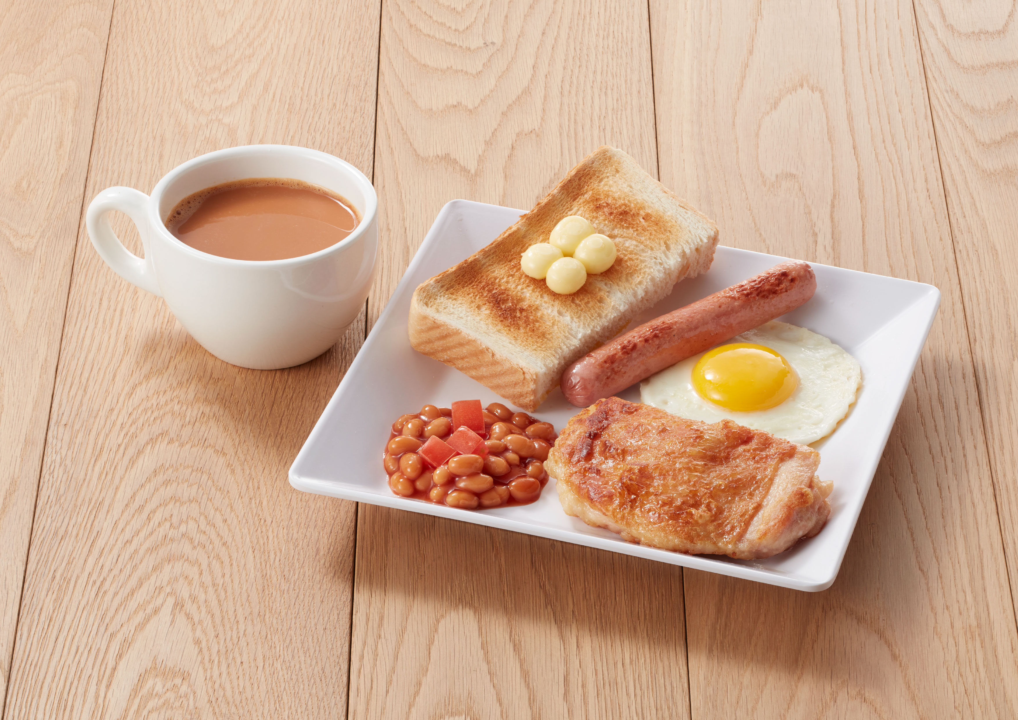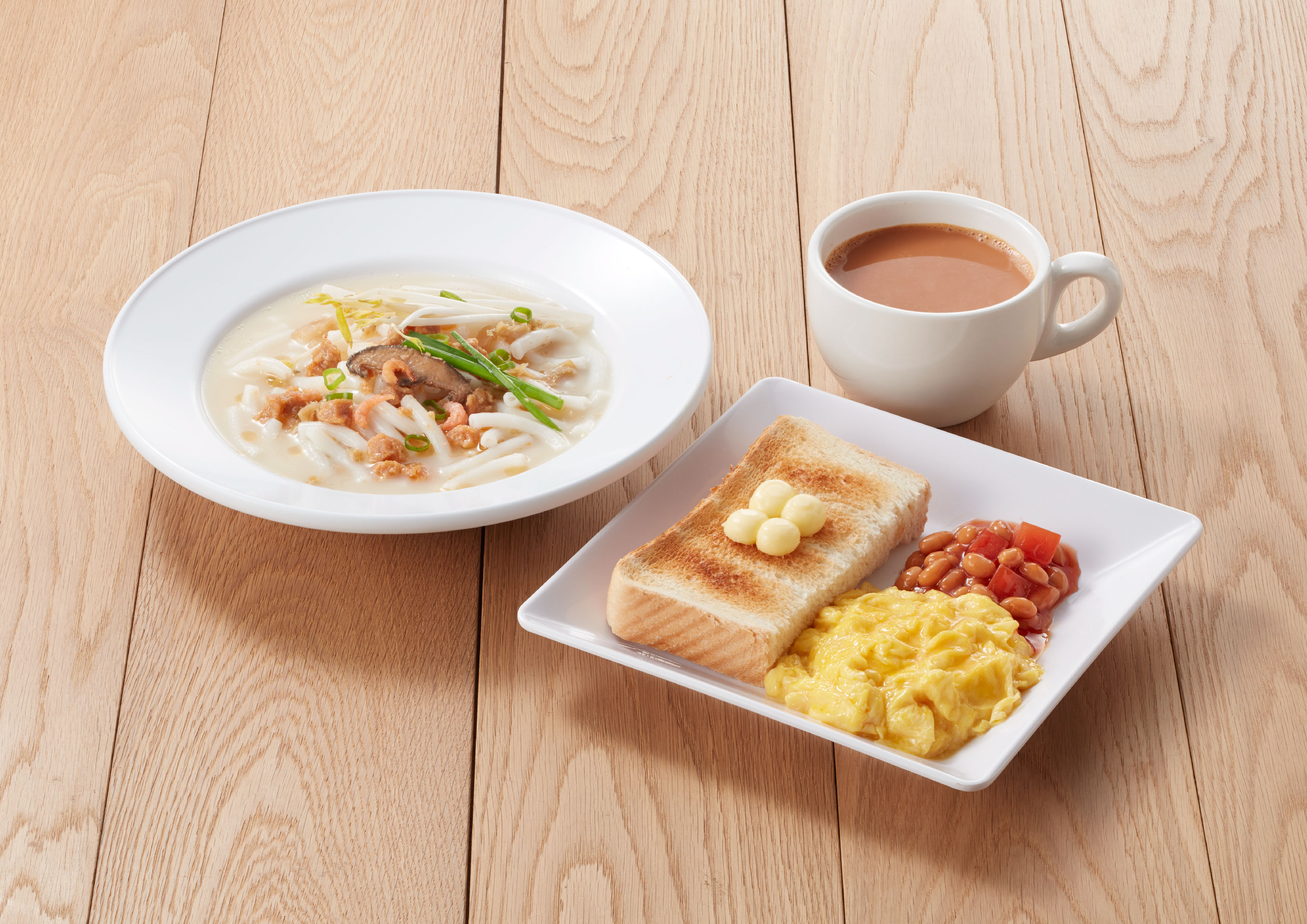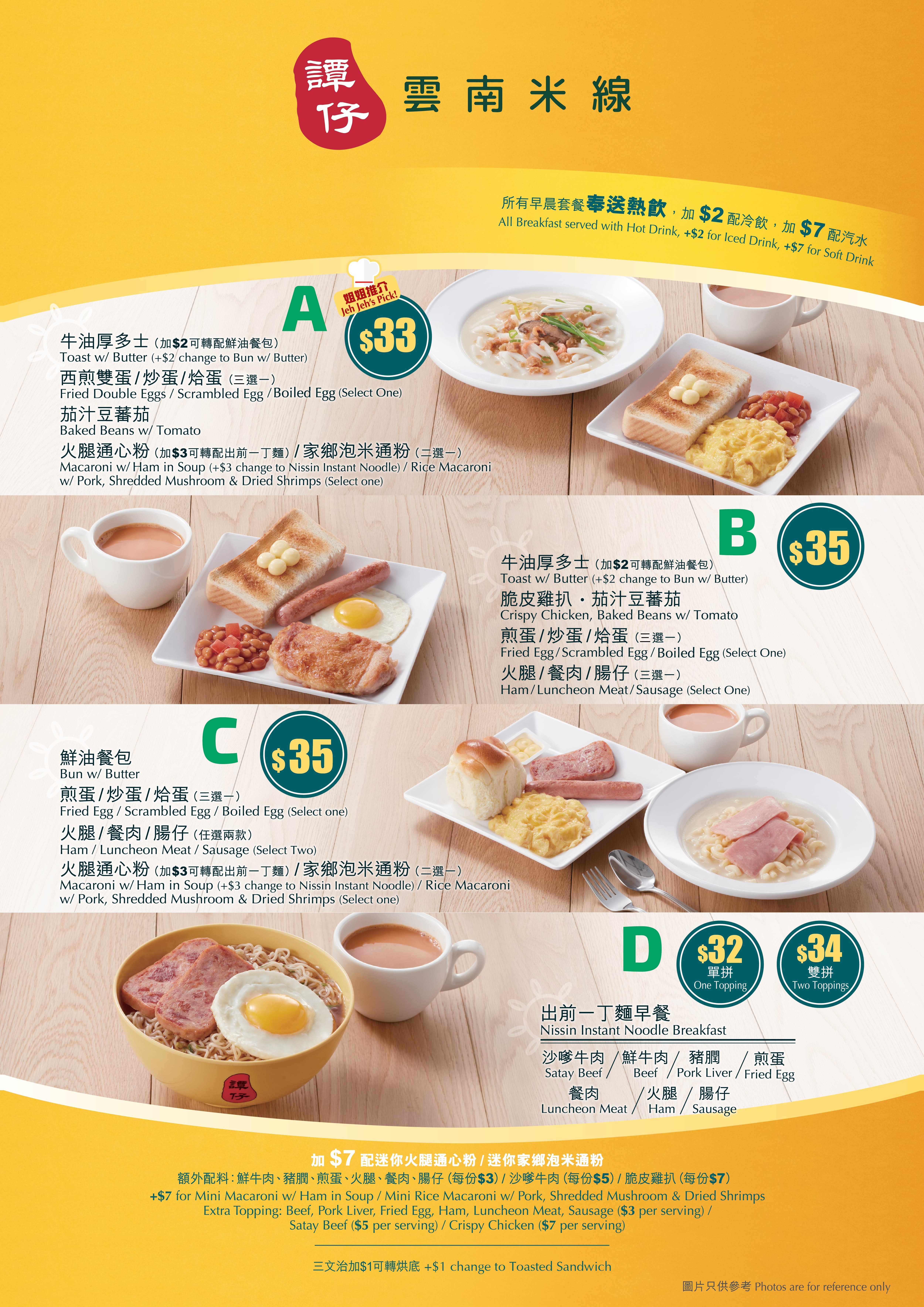另外特別推介「譚仔早晨套餐A連熱飲」及「譚仔早晨套餐B連熱飲」,前者售價為港幣$33起。套餐配有茄汁豆蕃茄、牛油厚多士,可加$2轉配鮮油餐包。自選西煎雙蛋或炒蛋或烚蛋;火腿通心粉或家鄉泡米通粉,或可加$3轉配出前一丁麵。
