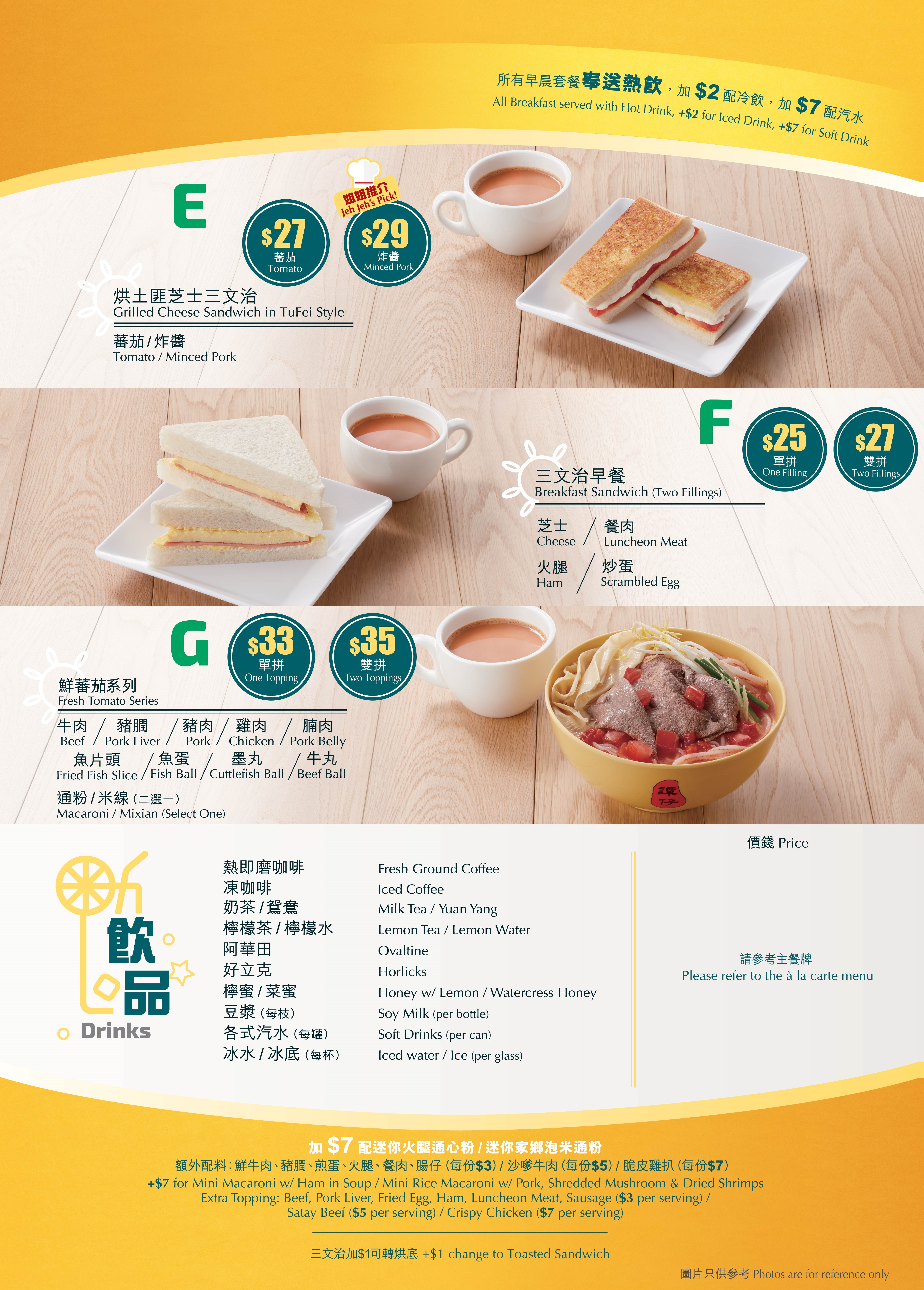 譚仔21間分店除了供應五款經典的港式早晨套餐,更特別推出「譚仔早晨套餐G鮮蕃茄系列」及「烘土匪芝士三文治系列」。