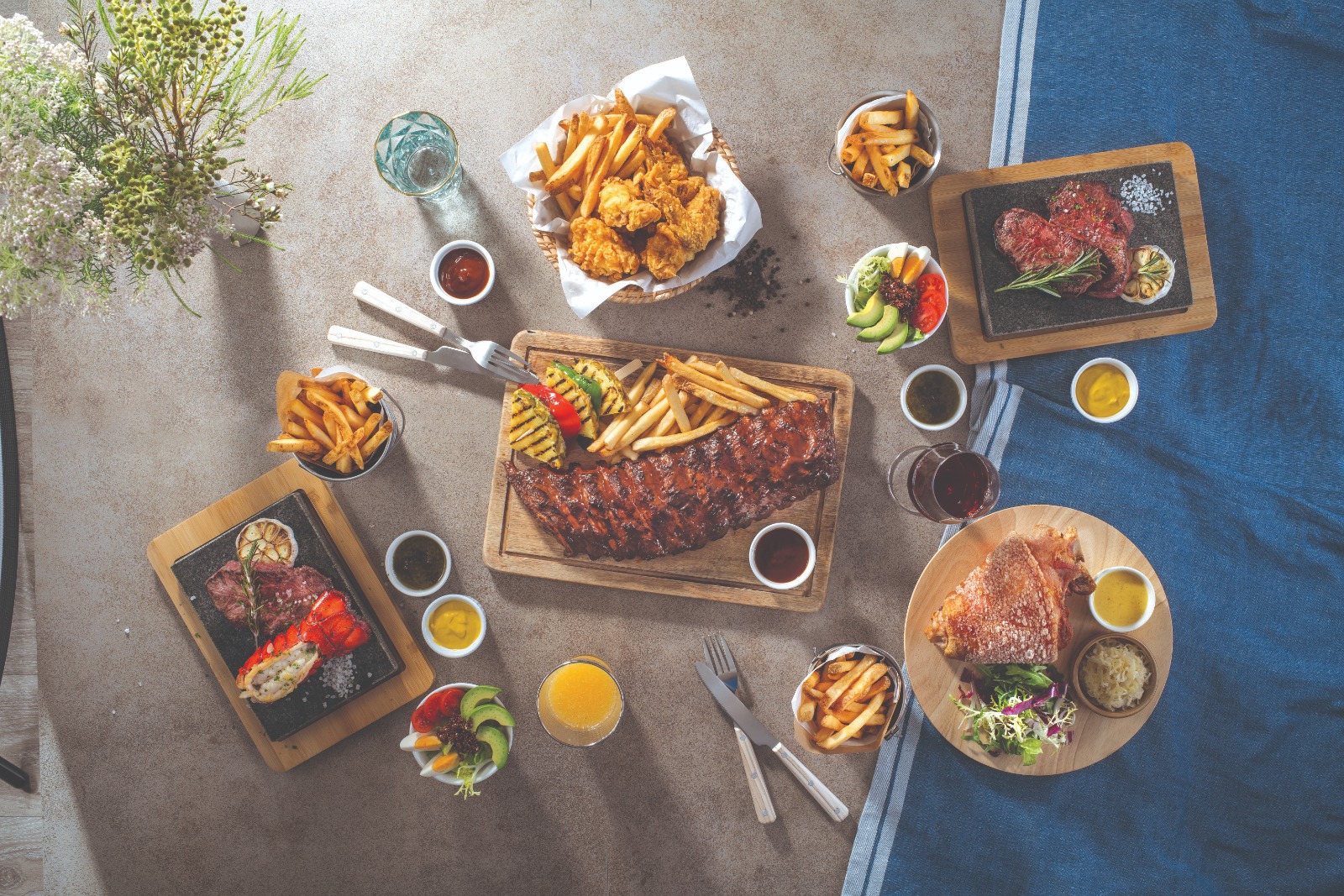 意粉屋亦設有各式主食,包括「醬燒原條丹麥豬仔骨(710克)脆薯條・烤菠蘿」、「石板燒龍蝦尾・美國牛肩肉(110克)配脆薯條・藜麥牛油果沙律」、「石板燒美國牛肩肉(220克)配脆薯條・藜麥牛油果沙律」、「德國鹹豬手・酸椰菜・脆薯條」及意粉屋招牌「炸雞・脆薯條」。