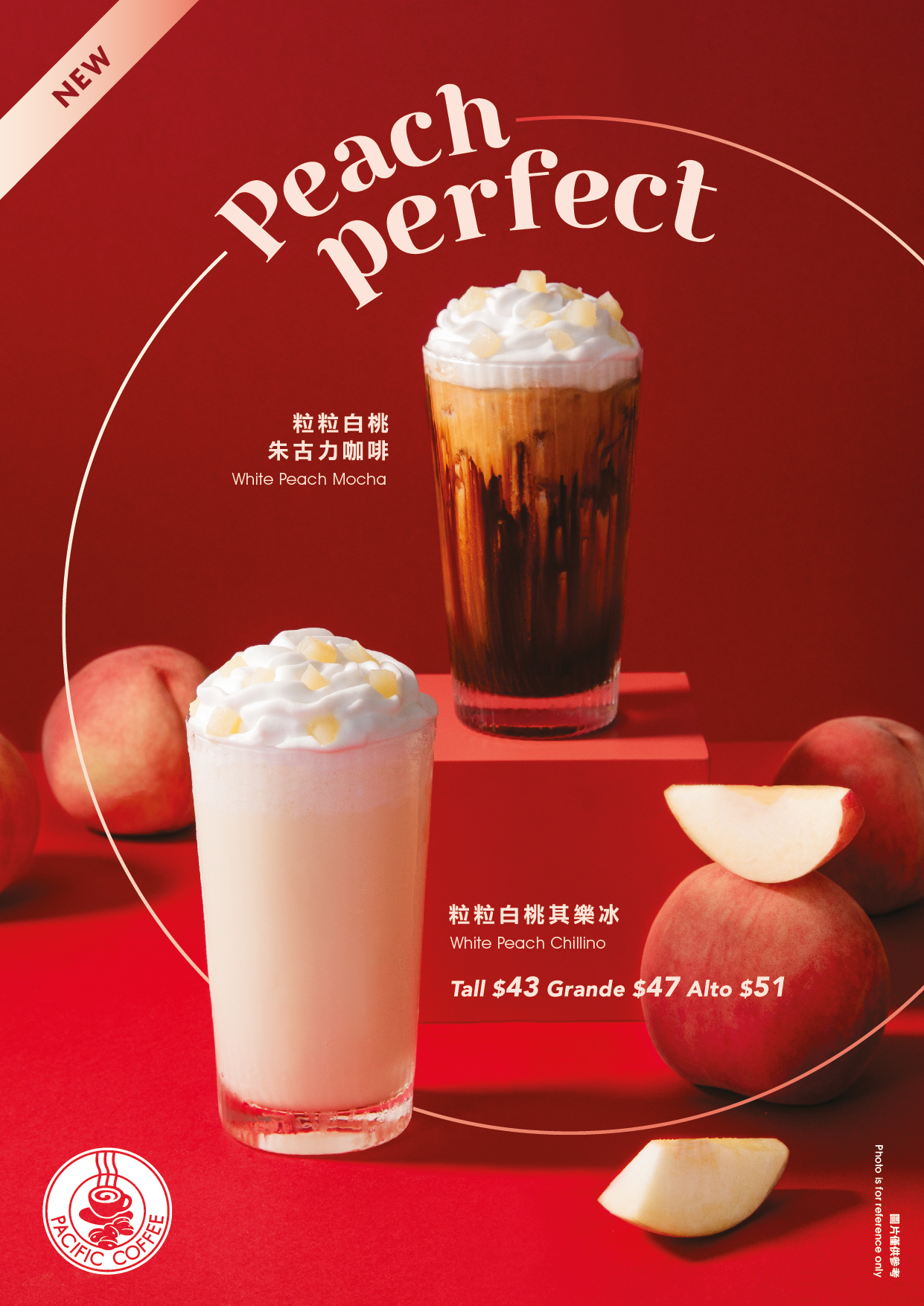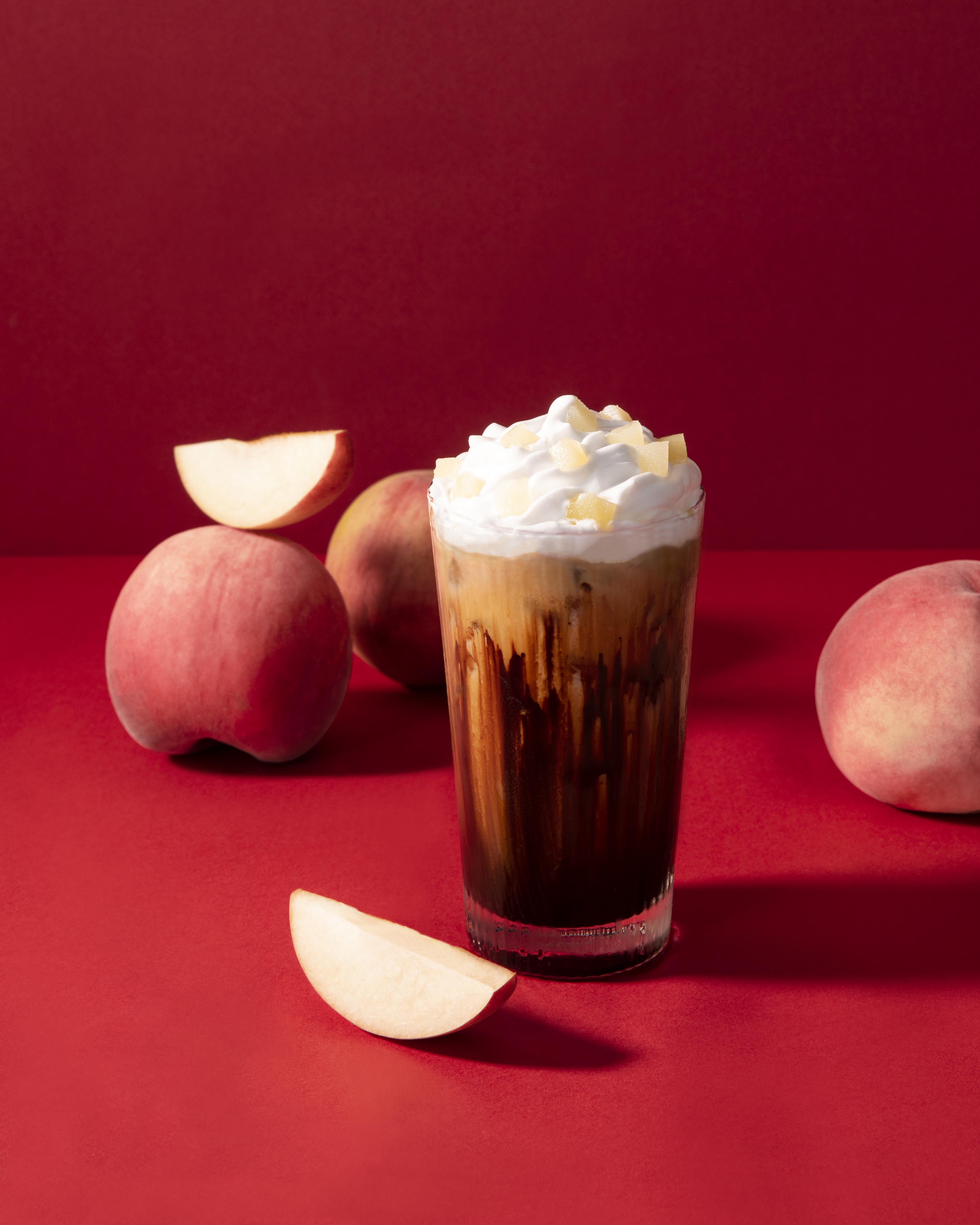 喜歡朱古力咖啡的朋友則可以一試「粒粒白桃朱古力咖啡」(標準裝:$43、大杯裝:$47、特大裝:$51),Pacific Coffee大膽地將經典的朱古力咖啡融合白桃元素,為咖啡控帶來全新體驗。特飲先有白桃的清甜果香,餘韻則有朱古力咖啡的甘甜濃郁香氣。加上面層的鮮忌廉及白桃肉,充滿驚喜。