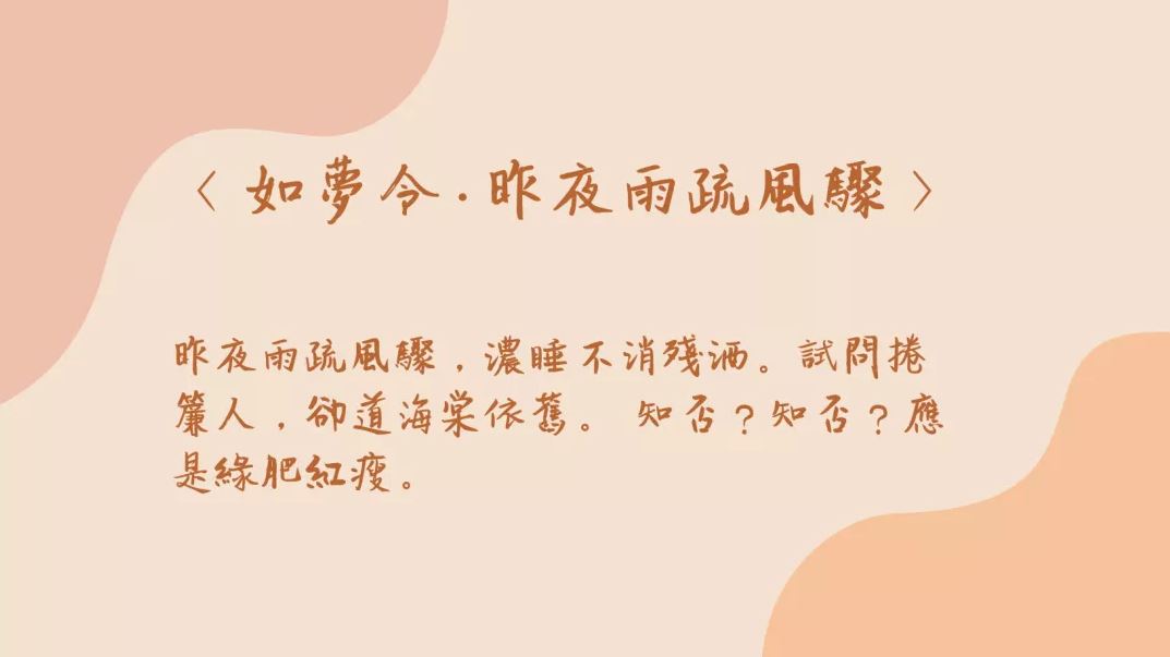 從「綠肥紅瘦」到「人比黃花瘦」,從「倚門回首,卻把青梅嗅」到「不如向,簾兒底下,聽人笑語」。對比李清照前後期的作品,我們領略到詞人的一生遭遇對其藝術風格的深刻影響。