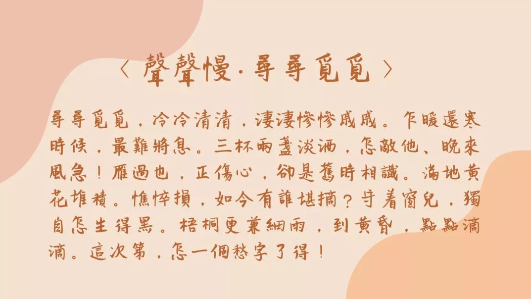 【橙訊】李清照(1084-1155),生於北宋神宗至南宋高宗年間,自號「易安居士」,今山東濟南人。中國傑出女文學家,其文學成就享譽古今、蜚聲中外。能書畫、工詩詞、善文章,尤以詞的成就最為卓著。其詞善於表達豐富的情感,刻劃完美的藝術境界,清新淺近,被譽為「易安體」,公認為「婉約派」的代表。