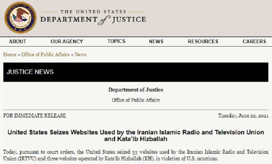 美國司法部表示已封鎖36個與伊朗有關聯的新聞網站。