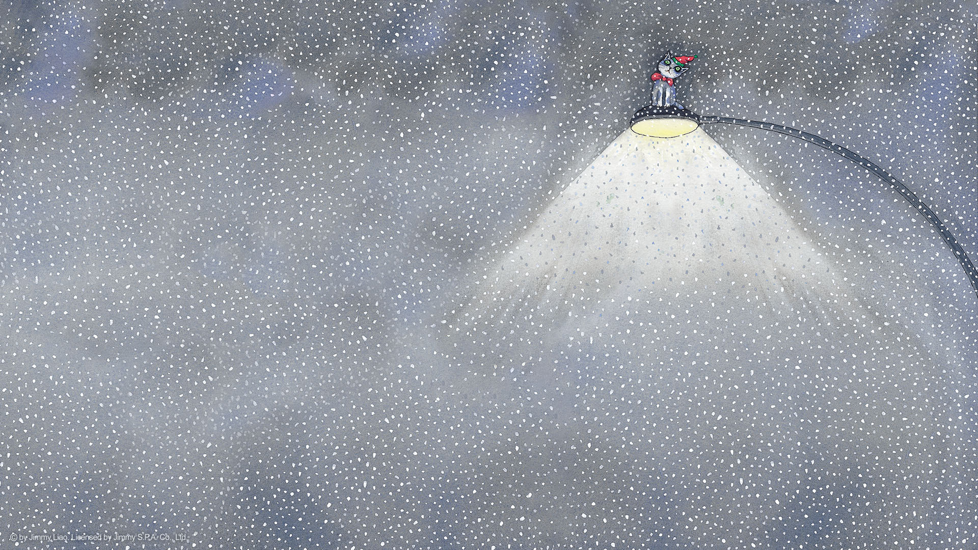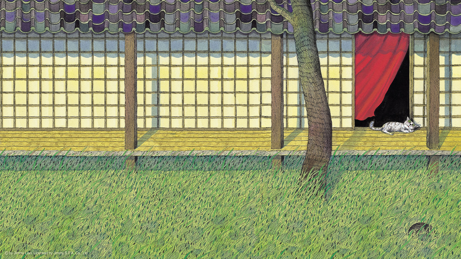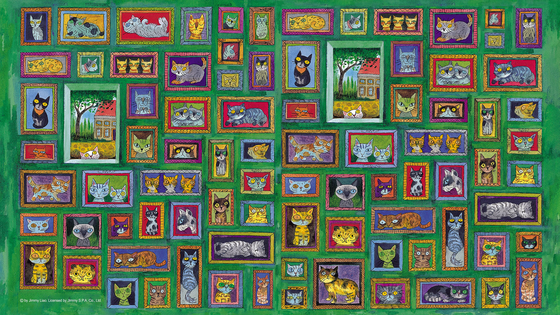 四幅畫中的貓咪或密密麻麻出現在相框裡,或臥於風吹過的門口,或在書架上小憩,或帶著天真眼神,站在下雪天的街燈上方。比起《我的世界都是你》中的四幅畫,這一系列更為簡單療癒。