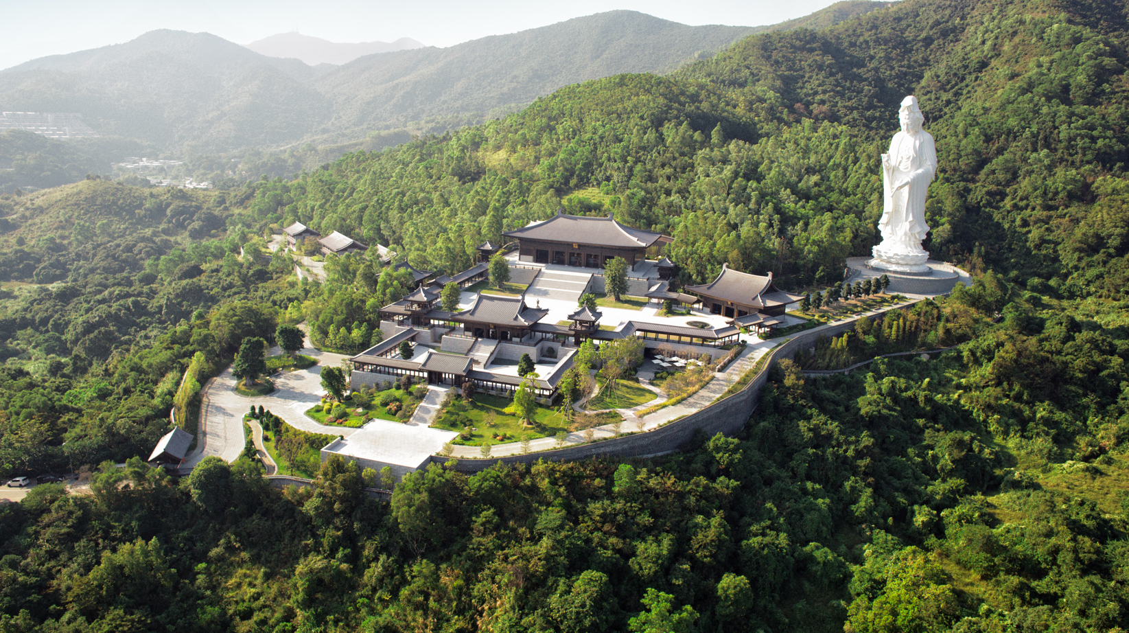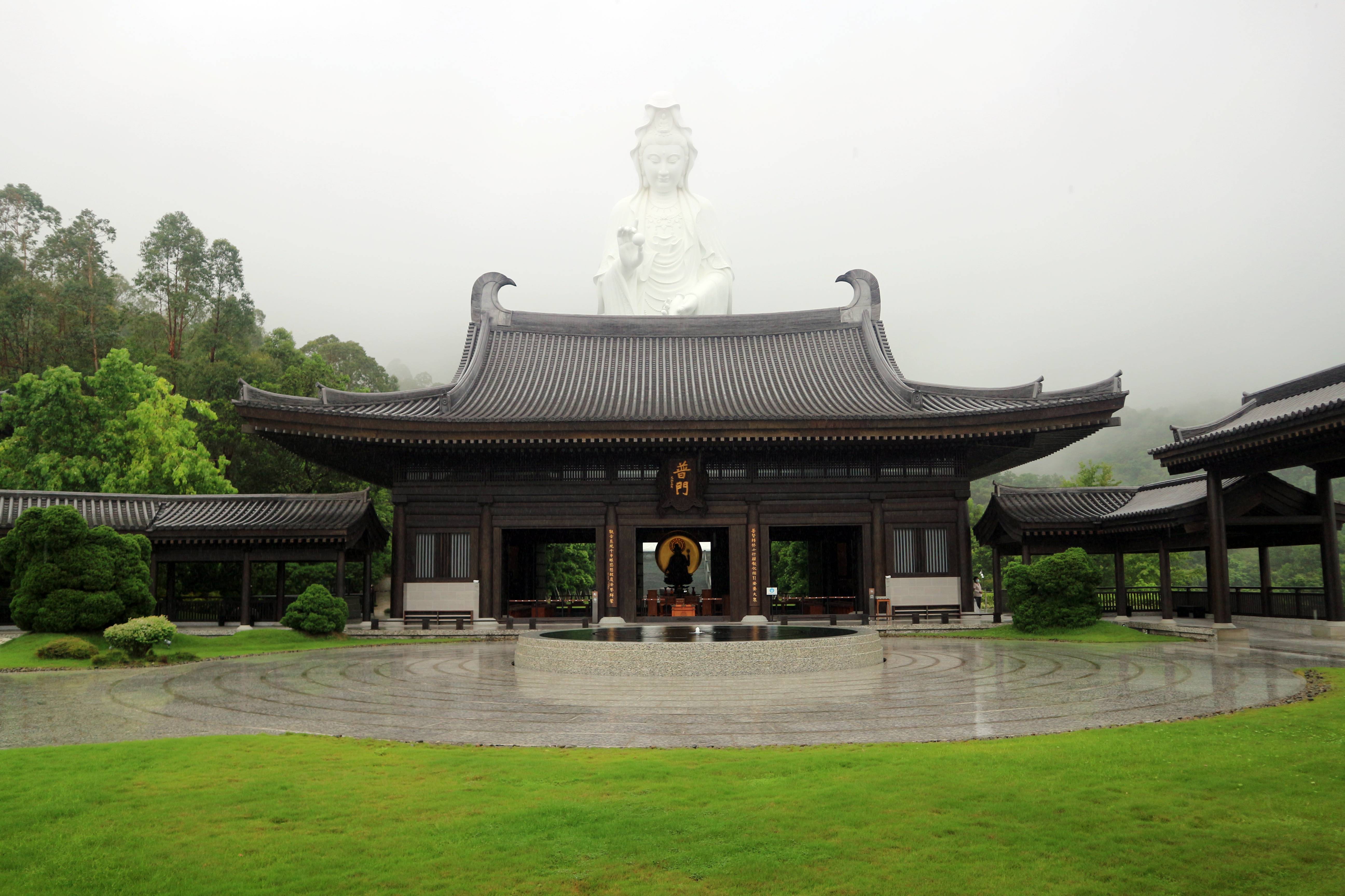 慈山寺的素白觀音聖像總高76米,前為普門(觀音殿)及洛伽池,四周共有11圈同心圓,雨中更具禪意