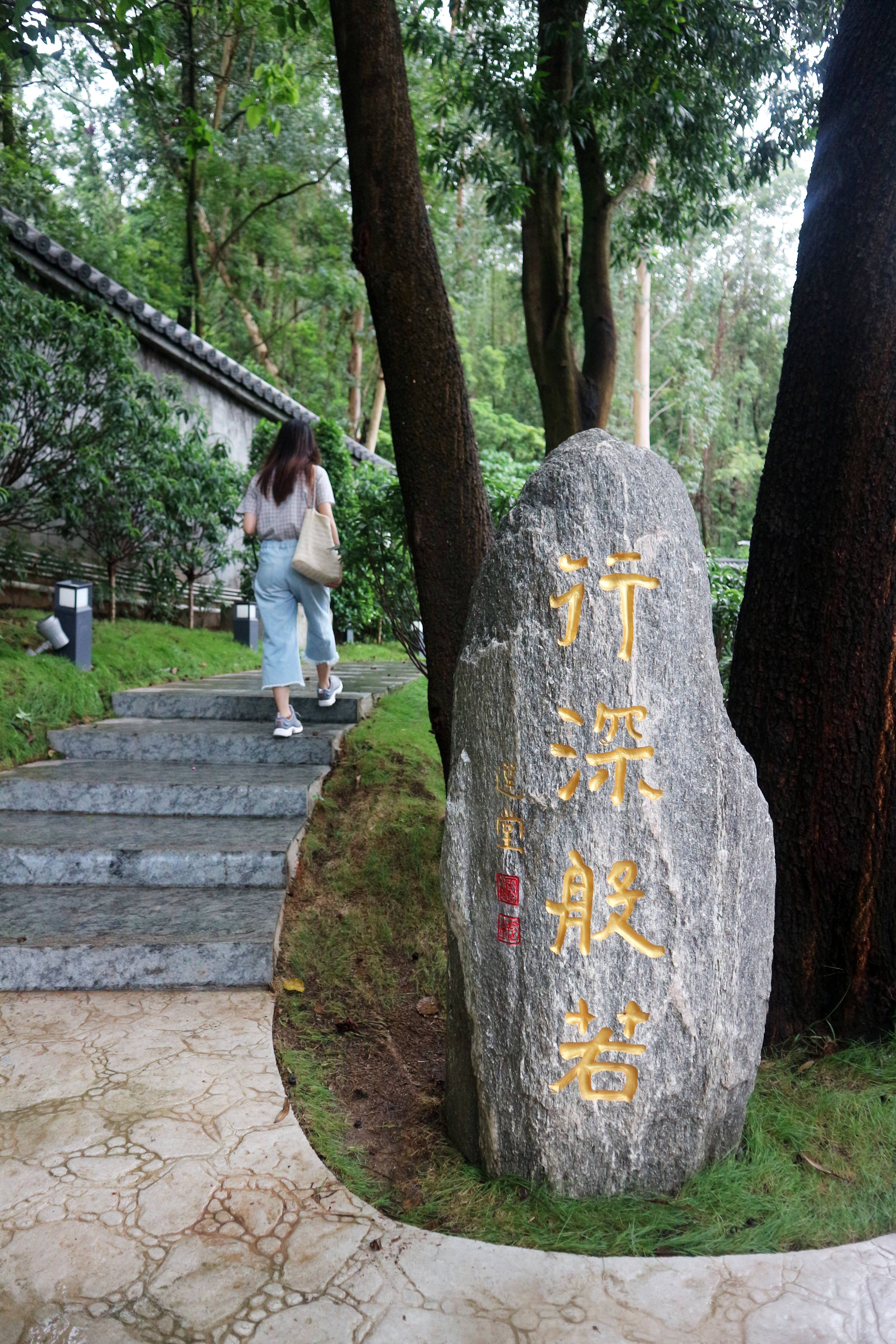 山林療癒由「正念徑」展開,長300多米的森林步道,始於一塊「行深般若」石。書法為饒宗頤大師所題,「般若」即智慧,站在智慧的起點,沿途打開形、聲、聞、味、觸五感,超過40種叢林珍稀深藏大自然的餽贈,如風吹葉墜的聲音、樹上的風鈴聲、或雨水拍落草地,迸發出的青草香。