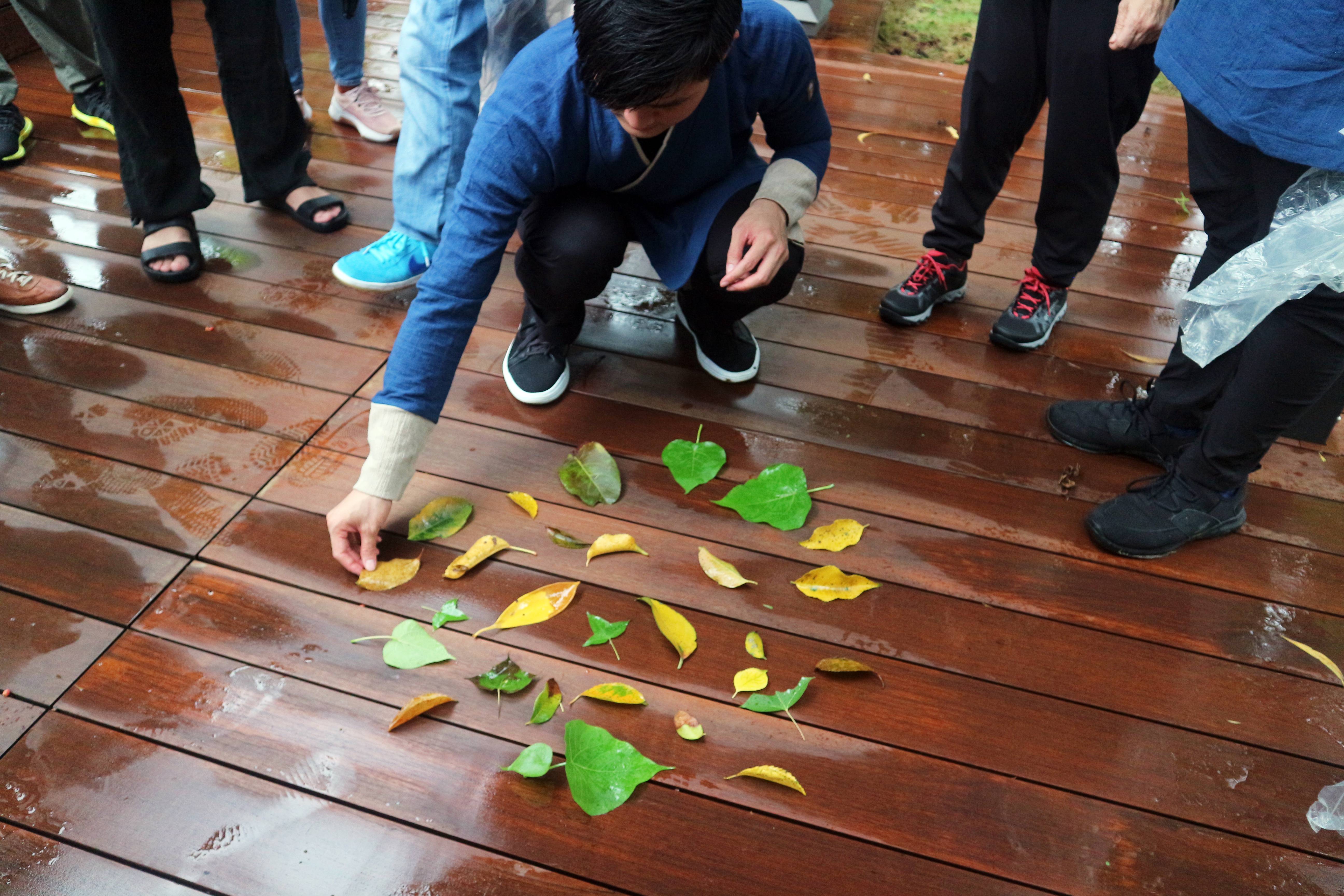 森林療癒陪伴員陳嘉偉示意大家把葉子圍成一個圓。「不同樹葉的大小、質感都不同,源於大自然的變化生生不息。我們邀請大家與葉子聊天、感受一下它們,最後將樹葉放回周圍的環境,象徵將好壞、美醜都放下。」一片葉的榮枯就像人的生命征途,化作春泥更護花,方能循環不息。在陪伴員的輕聲解說下,山林療癒亦圓滿結束。