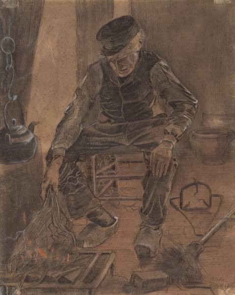 在28cm高的書籤上,垂直地繪畫了三幅未知的農民素描,這張書籤是在一本從法國農民視角出發,描述法國大革命故事的書裡面發現。紙和書的高度完全脗合,而且夾在書中一頁,因此相信是作為書籤來使用。書籤最上面的草圖描繪了一個女人走過一棵枯樹;中間的草圖描繪了一個坐在火邊的男人,這讓人想起梵高的另一幅作品——於1881年11月完成的《爐邊的老人》(Oude man bij de haard);而下面的草圖則描繪了一個女人的側面。