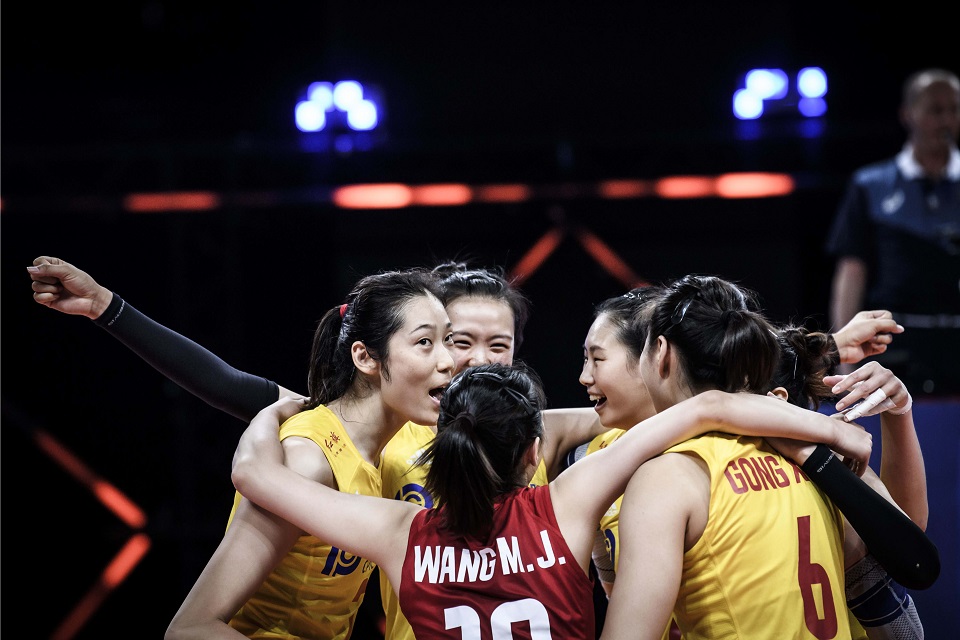 中國隊六月在意大利舉行的2021年世界女排聯賽預賽比賽中,以3比0戰勝美國隊。資料圖片