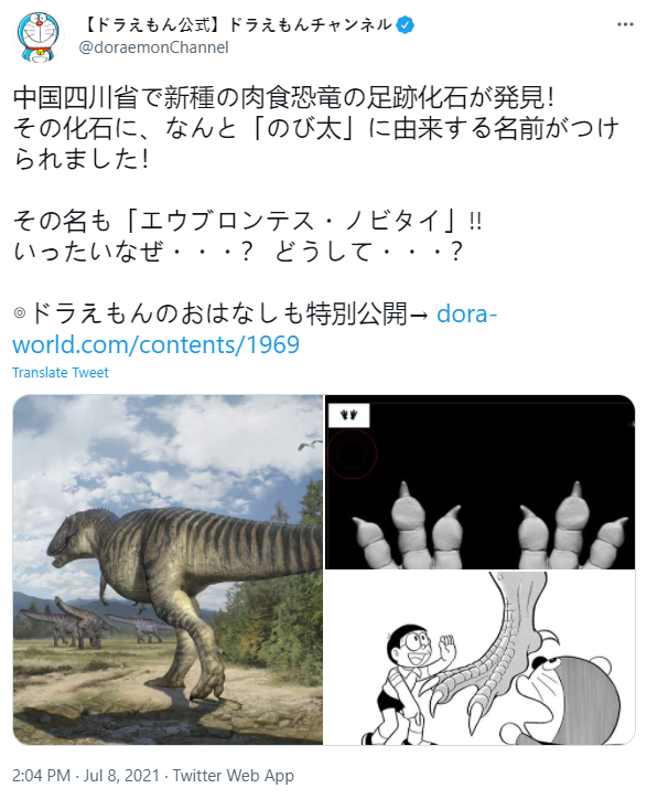 「我們命名為野比氏實雷龍足跡(Eubrontes nobitai),種名贈與野比大雄,是因為《大雄的恐龍》(1980年)和《大雄之新恐龍》(2020年),是優秀的恐龍主題電影,讓不少小讀者喜歡上恐龍。」
