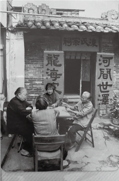 據三弟漢其的同學凌慧琼女士提供的舊照,可見祠內堊白的正牆,居中有紅漆神檯,絳丹掛帳,簪花成簇,點金奪目,上有「蘭桂騰芳」四字橫披,字寫顏真卿「顏家廟碑」體,很見筆力工夫;兩旁附聯作「河間世系登仁壽、龍海宗枝種福田」;「祀祖禮神祈福祿、維綱紹紀纘經綸」。「河間、龍海」一聯,所祝「登仁壽」、「種福田」,皆宗祠一般所用,含義吉祥;而「祀祖、維綱」一聯則精構深微,想是高人巧思,聯首綴「示」旁字寄祈祖福蔭之望,聯尾聚「糸」旁字表紹纘綱常之倫,字法不凡。再看,祠內桌案香燭細列,殷勤備事;瓷杯瓦盞,茶酒待斟。一派祥和,陣陣嚴肅。