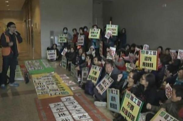 百多名參與罷工的外判清潔工,今早在威院新翼主樓大堂集會。他們不滿意新入職的員工月薪有9000元至逾萬元,但年資較深的員工反而月薪較低,只有大約8000元,認為不公平,要求同工同酬。