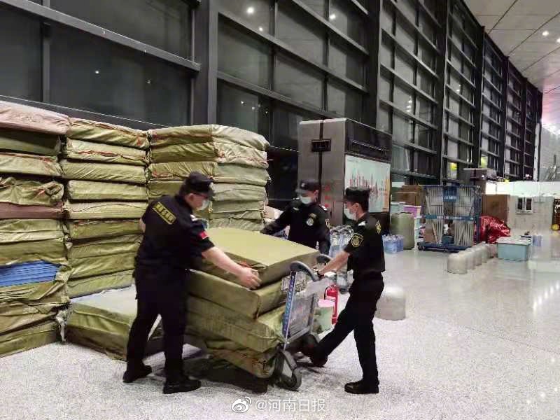 鄭州機場,工作人員準備為困在機場的民眾發放被褥等物資。