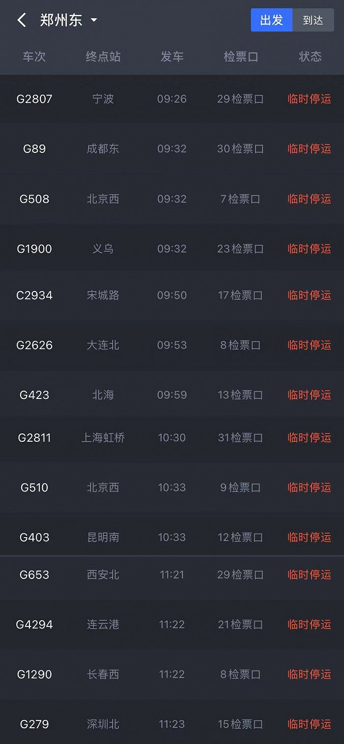 鐵路訂票系統可見,鄭州當地大批列車停運。
