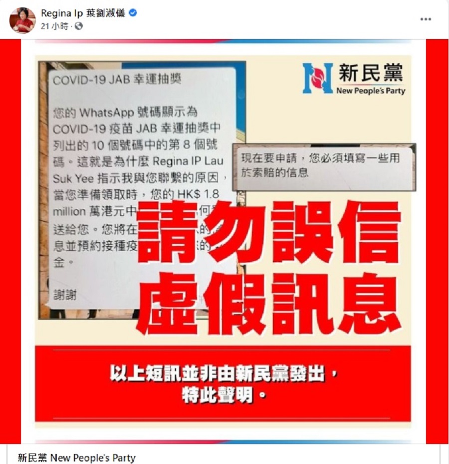 新民黨發言人昨在Facebook帖文,指近日接獲巿民有關反映,有騙徒假借葉劉淑儀名義,訛稱市民幸運中獎可獲180萬元獎金,從而要求他們提供個人資料,該黨澄清從未發出類似信息,叫市民勿誤中圈套。他又指,如有查詢,可於辦公時間致電3100 0079。