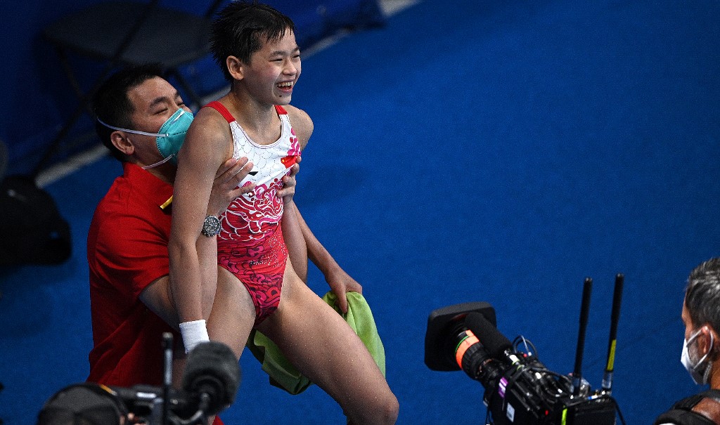 全紅嬋奪冠後,興奮的教練將她高高舉起。