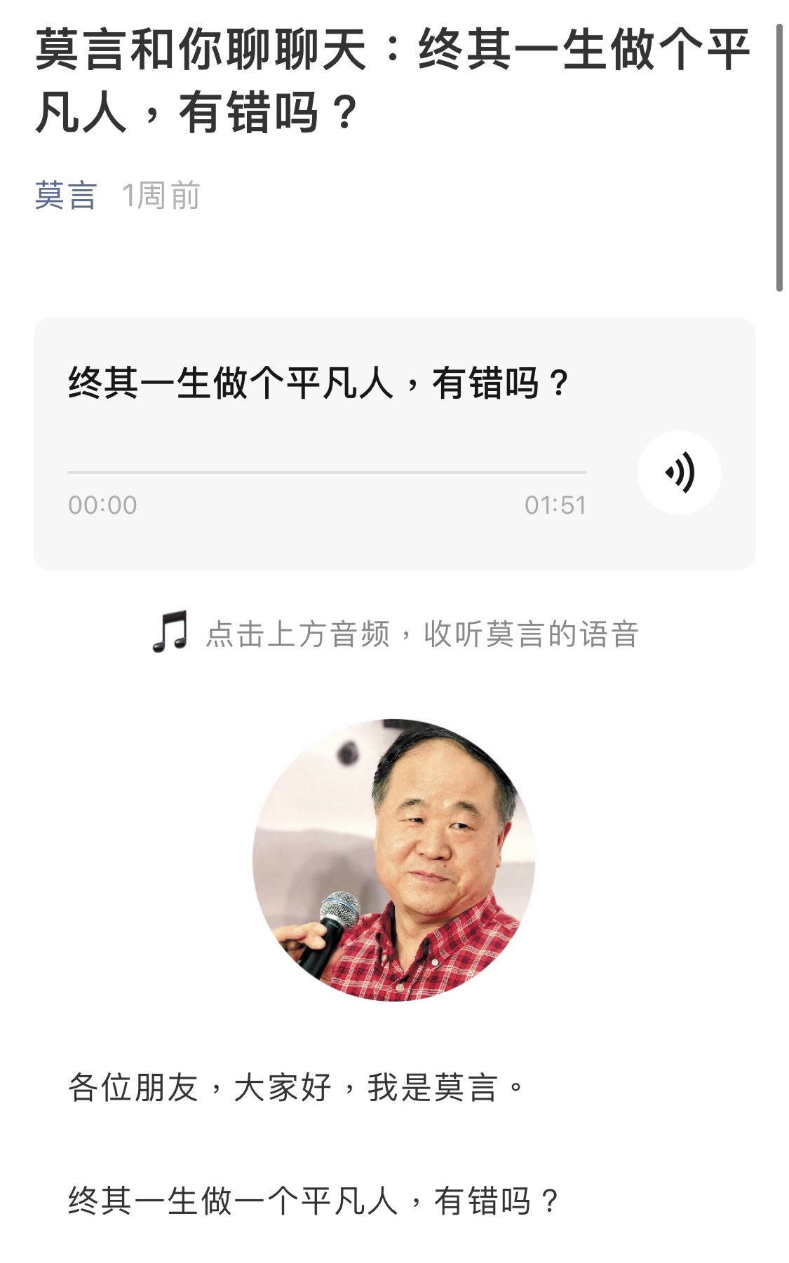 翻查記錄,微信公眾號「莫言」早於8月2日已推送出兩篇文章,分別為〈我為什麼叫「莫言」?〉及〈莫言和你聊聊天:終其一生做個平凡人,有錯嗎?〉在頭條文章中,莫言袒露自己從小多言,長大後更是愛說真話得罪人,因此在進入文壇的時候,便為自己起名「莫言」。文中除了講述童年往事,還加入不少自己的表情包,令讀者大呼「有童真」、「幽默」;至於二條文章則以隨筆的形式,分享自己對平凡與不平凡的見解,並附上語音方便讀者收聽。