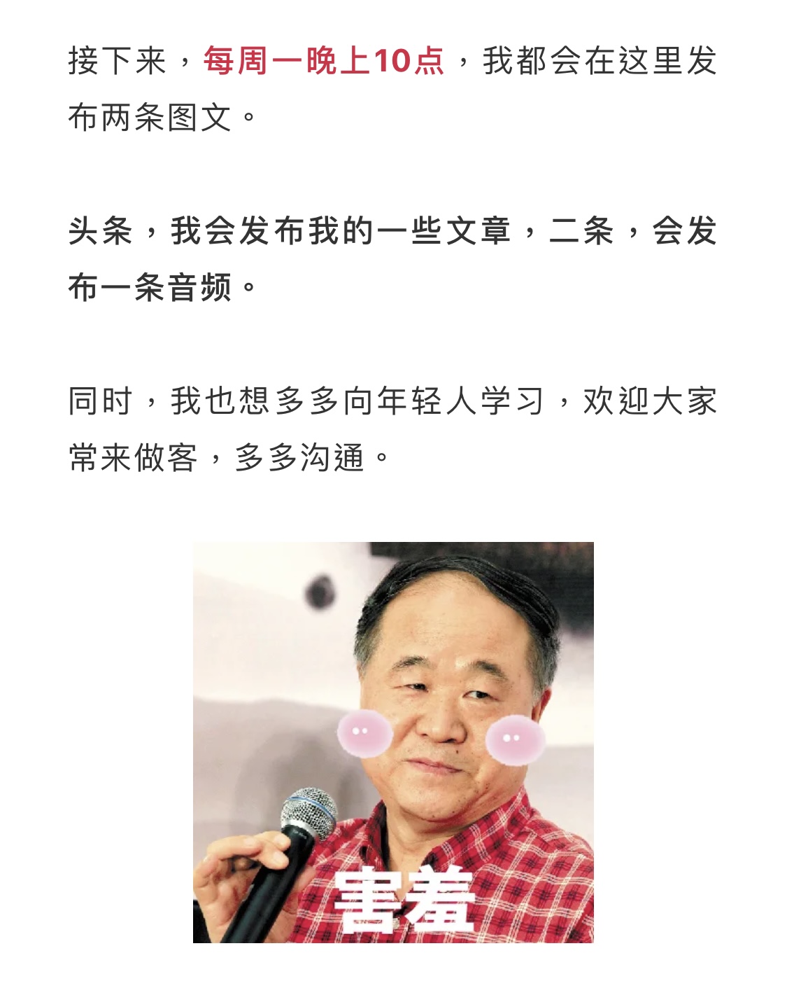 莫言指,每逢週一晚上10點,他都會在公眾號發佈兩條圖文。頭條會用作發佈自己的一些文章,二條則會發佈一條音頻。「歡迎大家常來作客,多多溝通。」