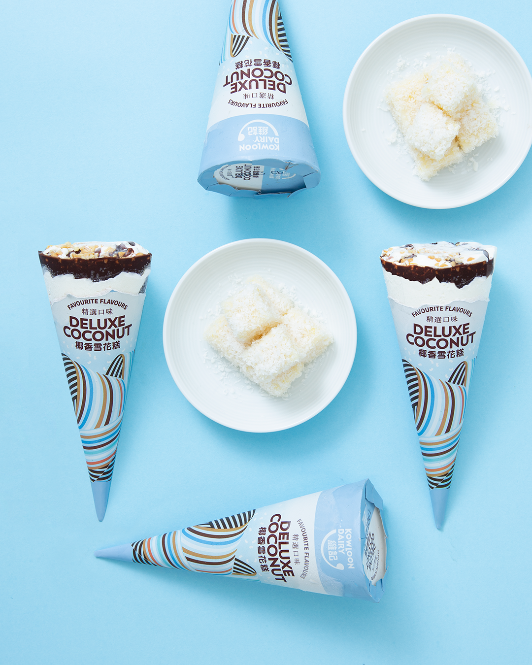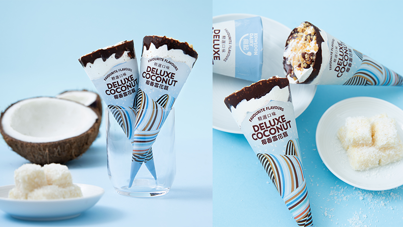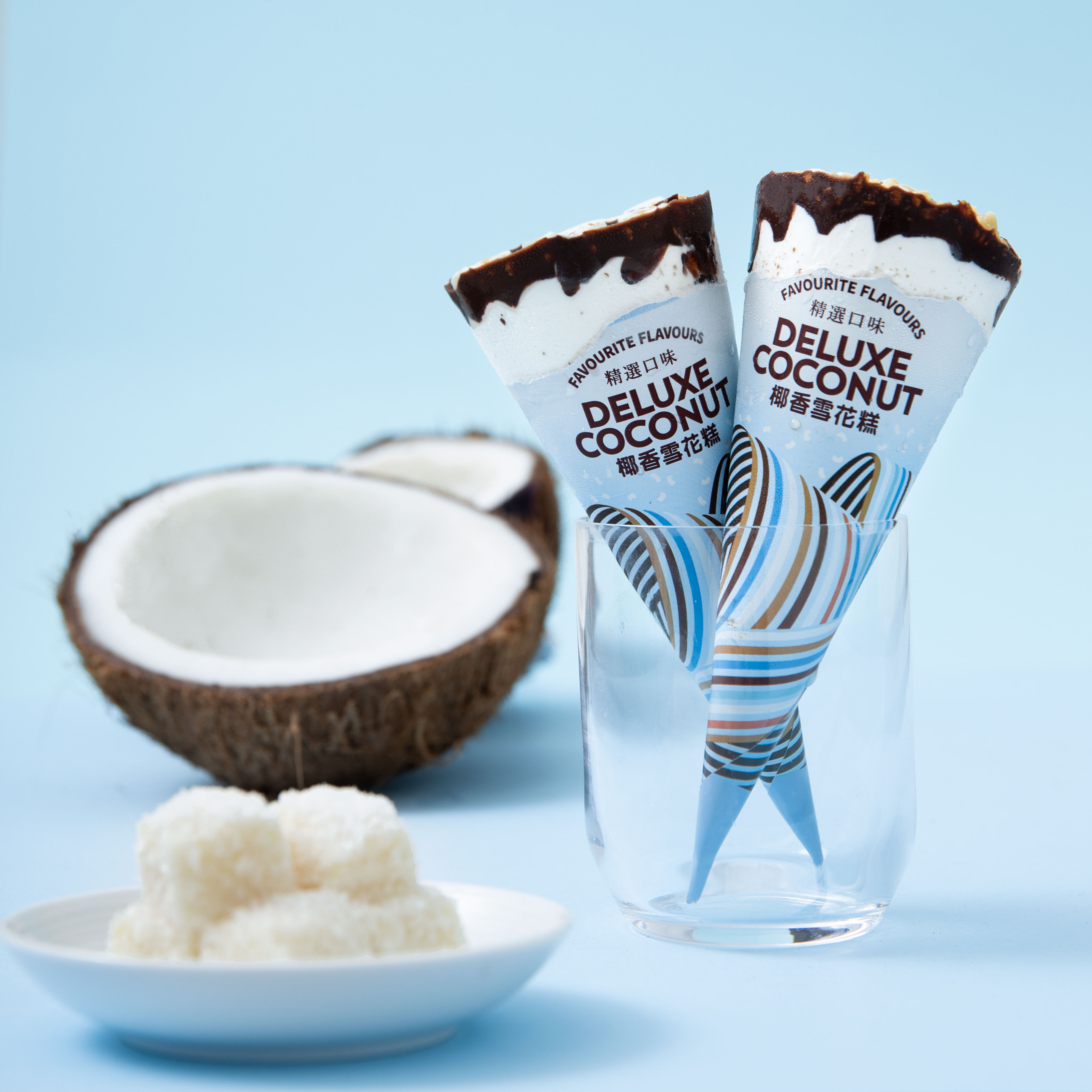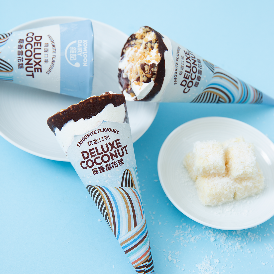 是次推出的「椰香雪花糕甜筒單枝裝」以扭紋雪糕為主調,選用具濃郁椰子香的幼滑雪糕結合椰絲及朱古力,每口都品嚐到清新椰子味,口感及層次皆相當豐富。外層加上香脆可口的脆筒,為懷舊的甜品味道增添多重滋味。