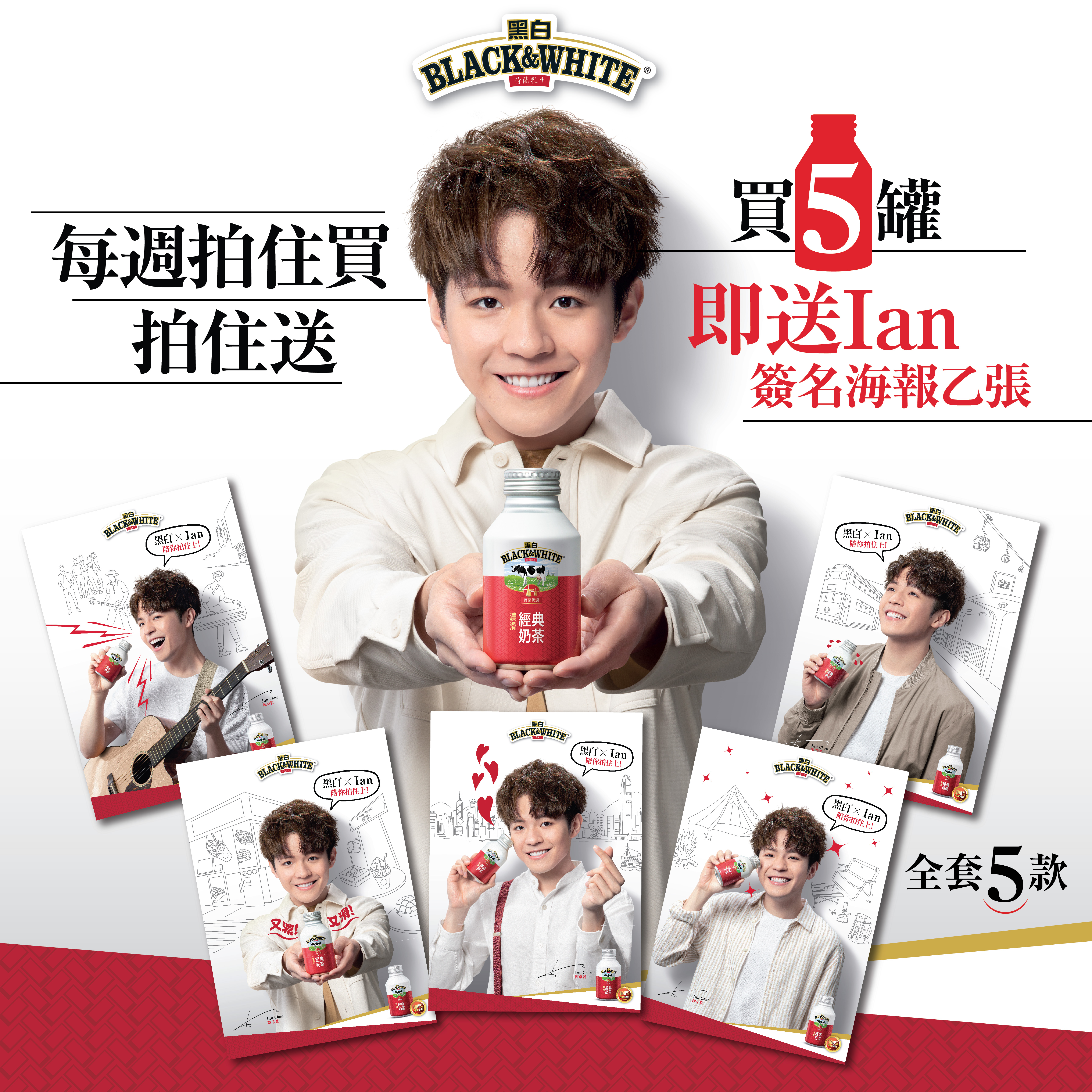 即日起至9月16日期間,凡於指定商戶(7-Eleven、OK便利店、百佳超級市場、FUSION、TASTE、惠康超級市場、Market Place、Market Place by Jasons及HKTVmall)購買五枝黑白®濃滑經典奶茶,憑有效電腦收據正本(「電腦收據」)或網上商店訂單紀錄(「訂單紀錄」)完成登記,即有機會換領Ian簽名海報乙張。全套五款海報均印有Ian不同的可愛甫士,無論是他的迷人側面、溫暖甜笑、自彈自唱或心心手勢,每一個動作都充滿攝人魅力,令人目不轉睛。