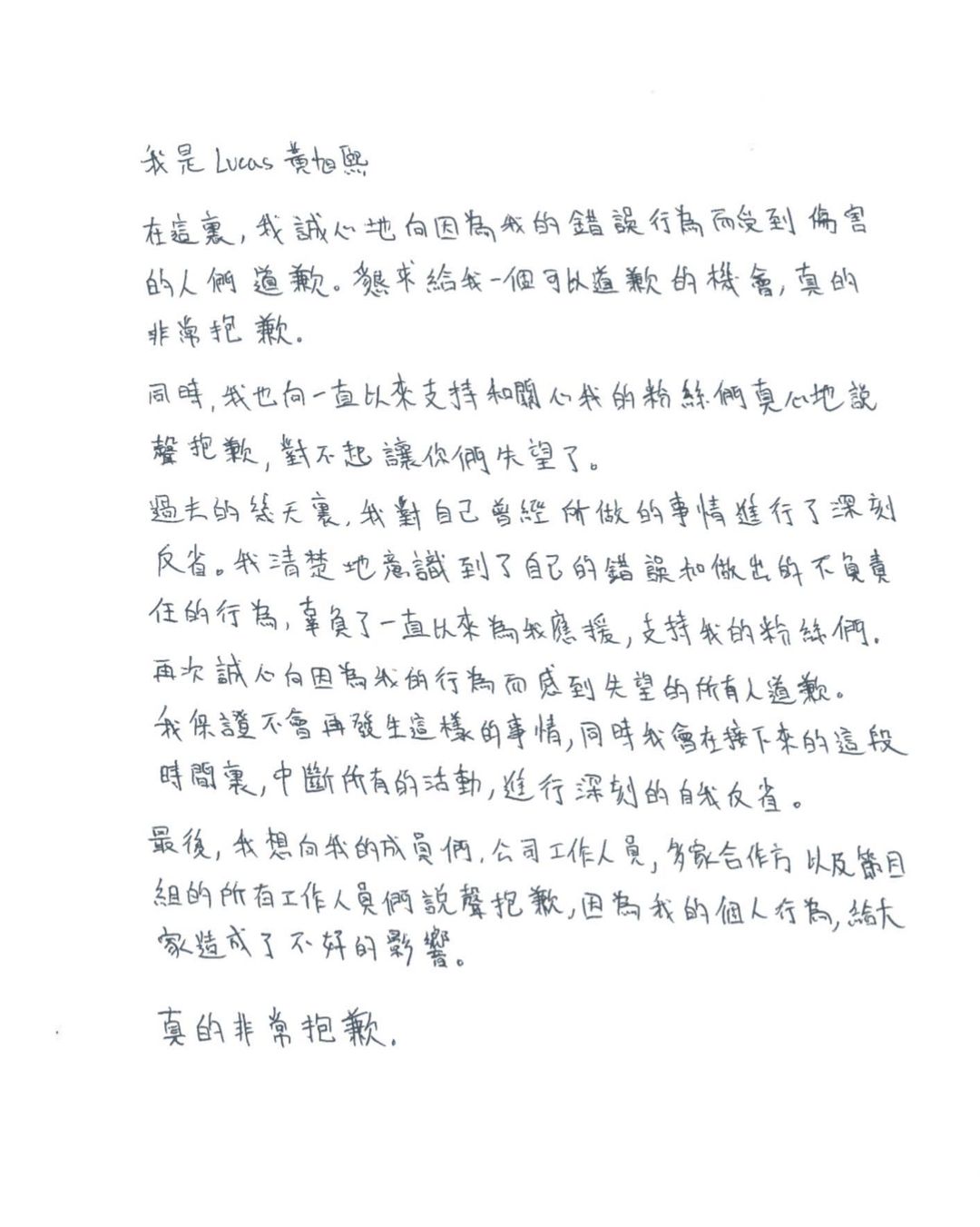 Lucas上傳手寫信道歉,並宣佈中斷活動