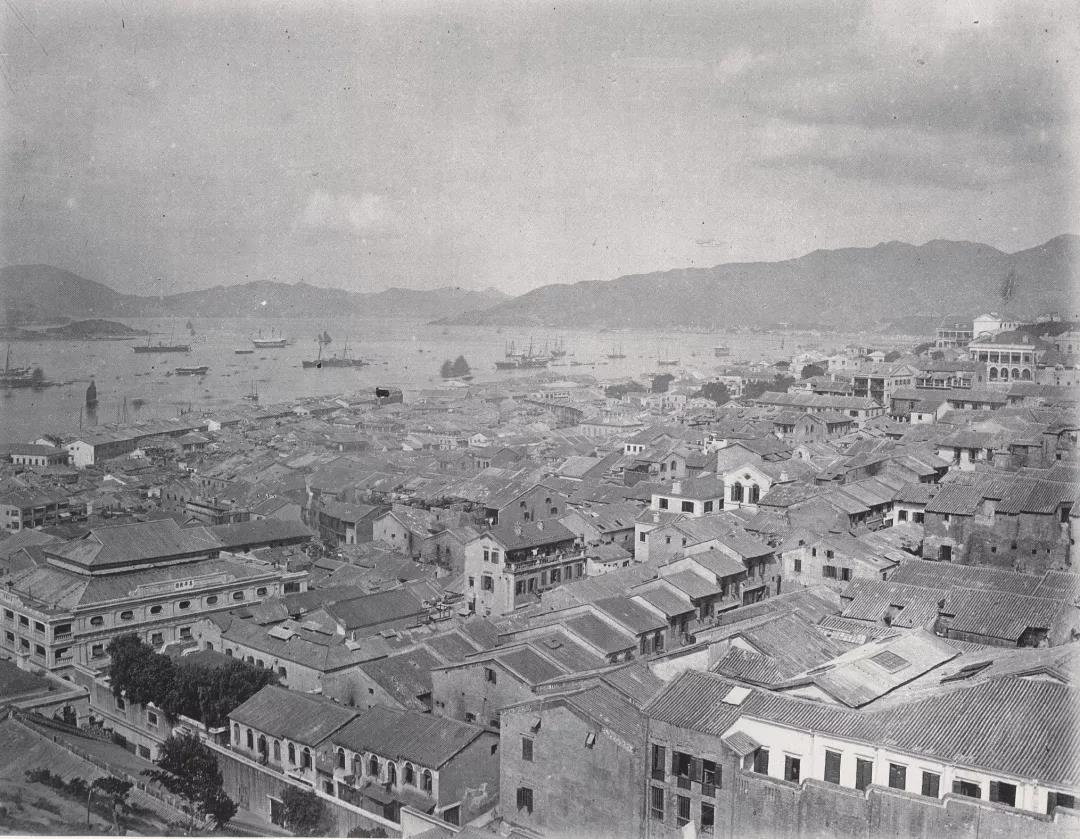約1875年華人居住的寮屋區。右中部為太平山街市所在,中前方有兩個窗戶的屋宇是街市街(普慶坊)的同慶戲園。左下方是東華醫院,其旁邊的宏偉建築是位於太平山街與普仁街交界的昇平戲園。
