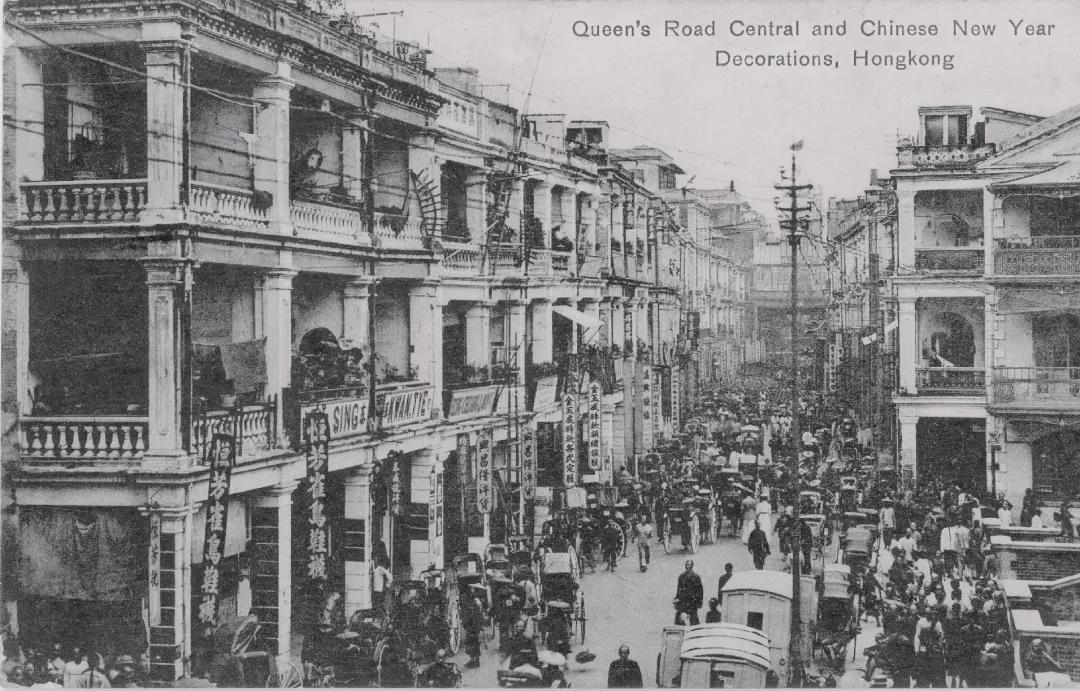 約 1905 年的皇后大道中。右下方為中環街市的入口橋道,中前方可見兩部馬車。左方恒芳雀鳥旁是閣麟街。這一帶於 1841-1842年間是第一代廣州市場所在,亦為早期華人居住區內的「上市場」。
