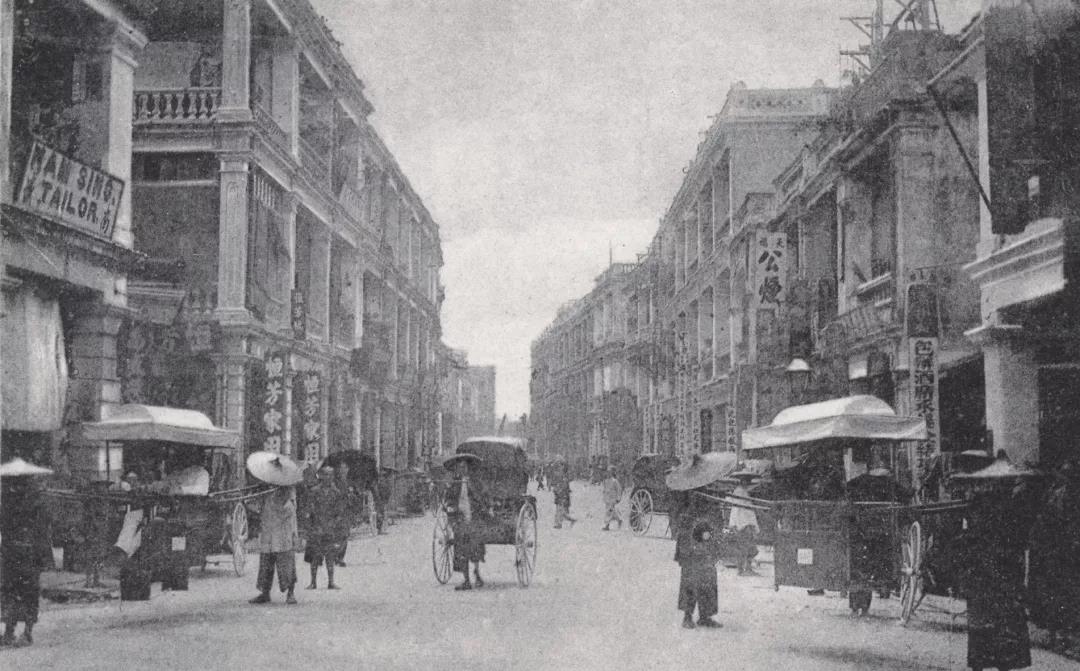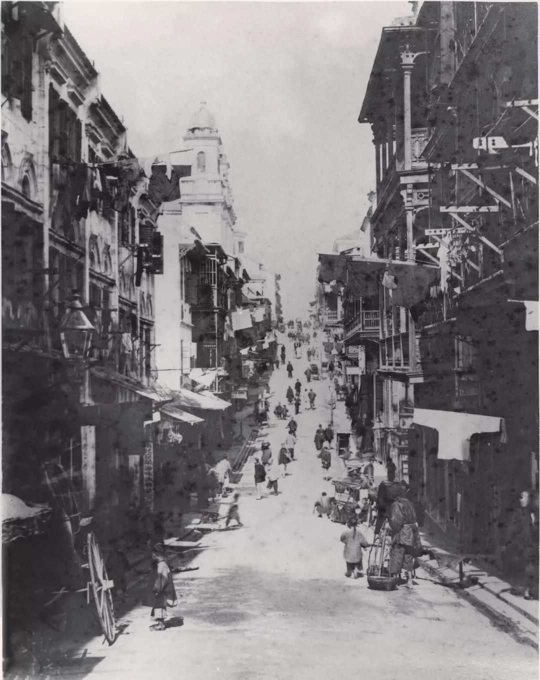 由雲咸街望向威靈頓街,約1880年。左中部現為鏞記酒家所在,其上方有雙塔的建築物是位於與砵典乍街交界的第一代聖母無原罪教堂。街上可見小販攤檔。