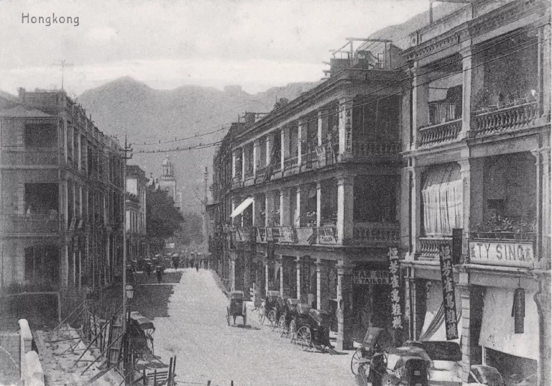 皇后大道中,約 1894 年。正中的樓宇於在其後1910年代及1920 年代依次開有馬玉山茶樓及第二代高陞茶樓。左下方為正在重建的中環街市,於 1895 年落成。遠方可見位於畢打街的鐘塔。