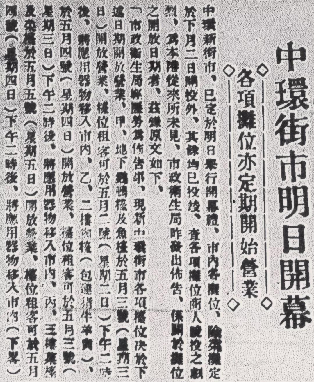 報章上有關第四代中環街市(即現時的一座)重建落成,將於1939年5月1日舉行開幕禮的新聞。