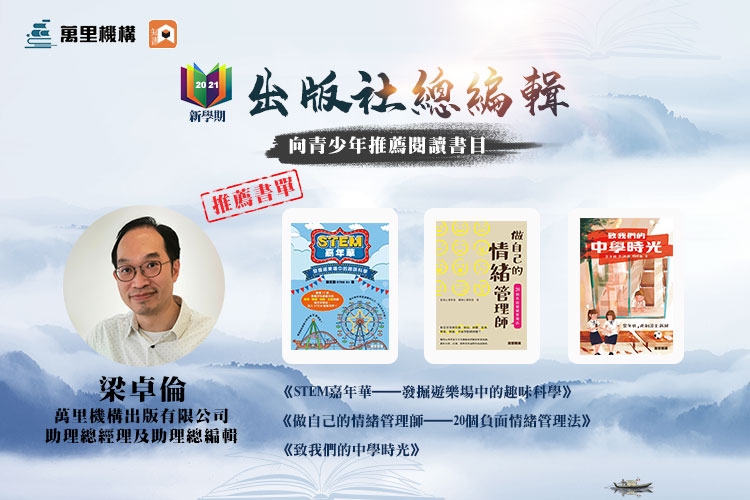 萬里機構助理總編輯梁卓倫為青少年精選三種熱門好書:《STEM 嘉年華──發掘遊樂場中的趣味科學》、《做自己的情緒管理師──20個負面情緒管理法》以及《致我們的中學時光》,並表示:「開卷有益,這是歷久常新的金句。儘管今天網上資訊發達,但碎片化的信息只會帶來片面的印象,而且很可能過目即忘。讓忙碌的拇指休息一下吧。讓我們重新拿起書本,感受一下那分量──踏實、充盈,而且有滿滿的情感。」