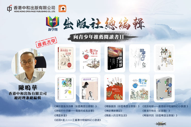 中和出版總經理兼總編輯陳鳴華則推薦《流浪地球──劉慈欣中短篇科幻小說選》、《追殺 K 星人──王晉康中短篇科幻小說選》、《呼吸的牛仔褲──青春的成長故事》等深受青少年喜愛的小說,同時推薦了《粵韻唐詩》、《粵韻宋詞》、《廣府童謠氹氹轉》,書中輔以彩圖及粵語配音,幫助孩子更有效地認識粵語文化。