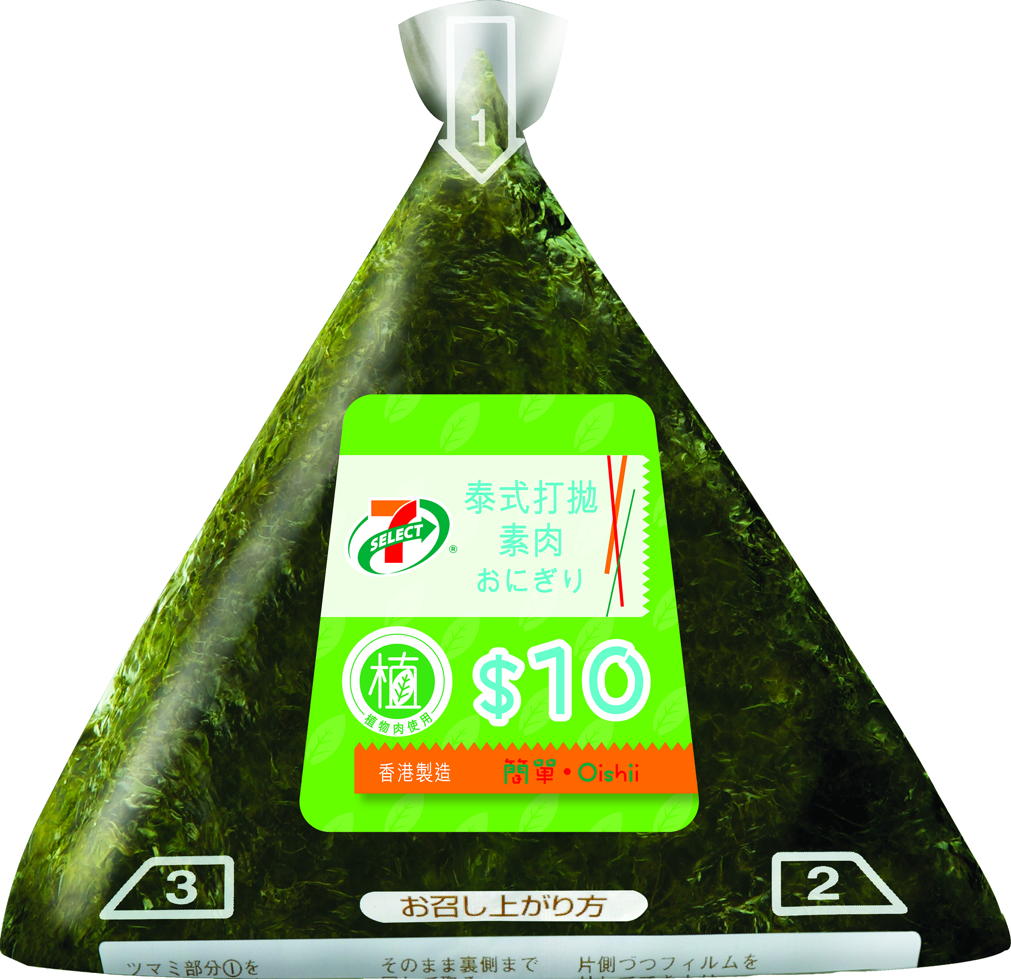 今期素食新品有齊飯糰、包點、點心選擇,除了可以用作三餐醫肚,宵夜時段享用亦甚是滋味。素飯糰共有兩款新口味,包括「素肉鬆飯糰」($10)及「泰式打拋素肉飯糰」($10)。「素肉鬆飯糰」採用以大豆蛋白為原料的植物肉,經高溫烹煮後的植物肉鬆口感鬆軟。
