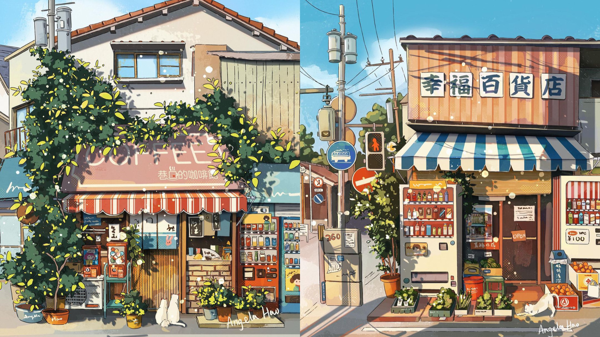 Angela H.藉著Google街景服務,造訪日本的大街小巷,盡情探索在街道上有趣的風景,繪出一間間令她印象深刻的獨特店舖。為了避免與其他藝術家使用同一素材,她在繪畫前總是會進行大量資料搜集和研究,並用Photoshop添上自己想像的元素,再參考Google地圖上顯示的實景,一幅幅獨一無二的作品就此誕生!