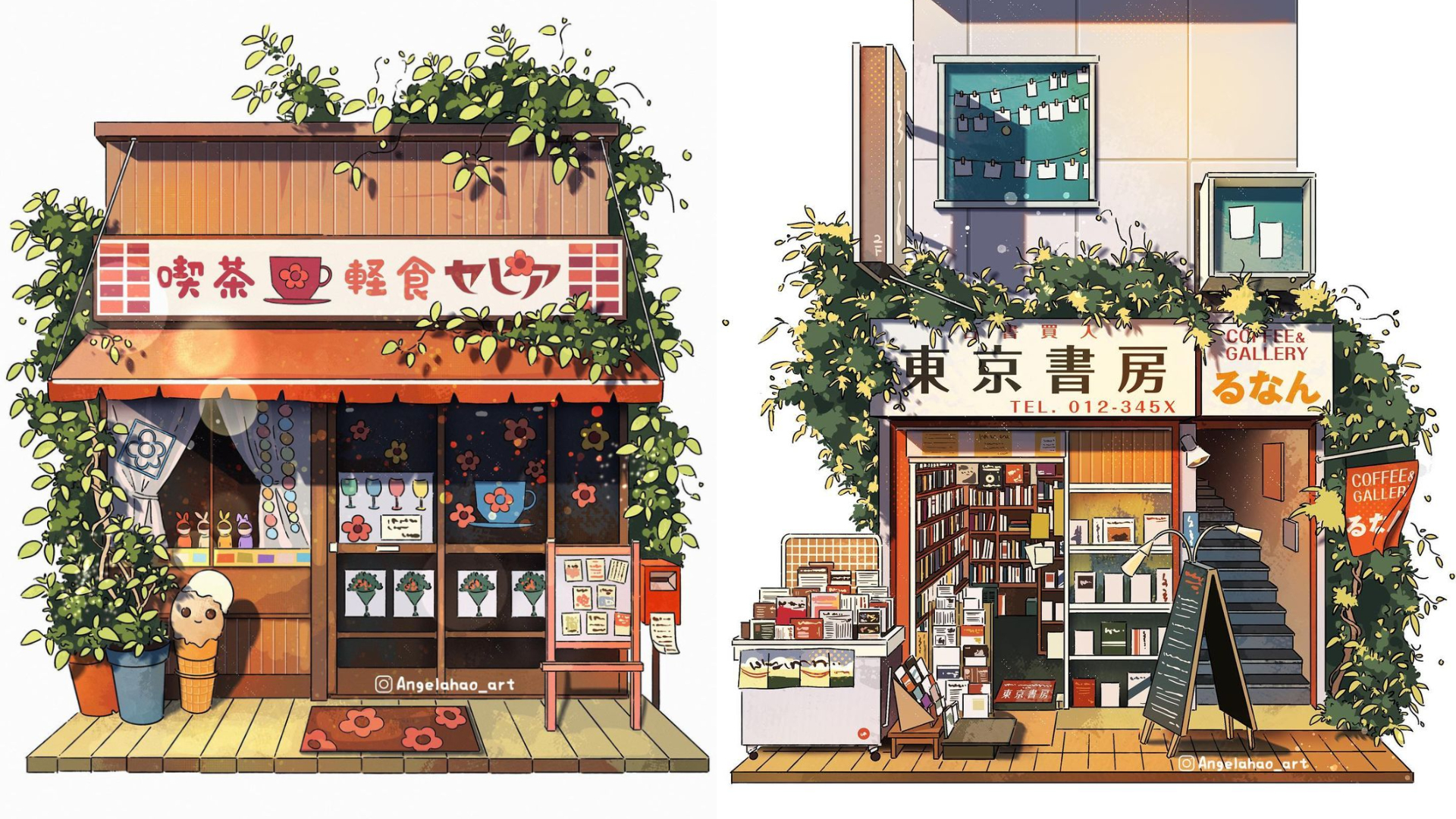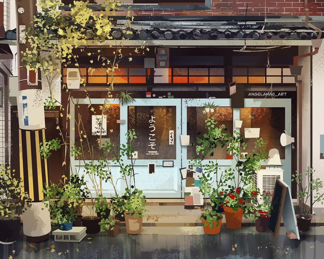 除了自己的探索外,Angela H.還會繪畫網友提供的照片,並將其變成「365天繪畫挑戰」,每天都畫出一間她認為極具特色的店鋪——有書房、餐廳、咖啡店、雜貨店、服裝店等,不過小編發現,她並非以一天一畫的方式發佈作品,與其說是365天,不如說是365家店舖,這些不同的店舖經過Angela H.之手後,都會變得風格鮮明統一,就像是出自同一個漫畫小鎮一樣,而且她喜歡在店鋪加上綠意盎然的植物,令平凡的店面變成一道道怡人的風景。