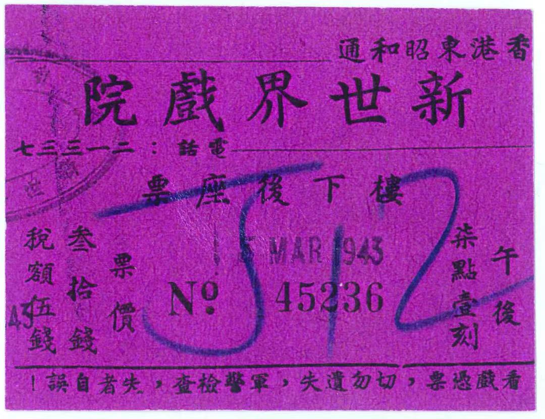 新世界戲院戲票。樓下後座票價為三十錢,另加「娛樂稅」五錢。日佔時期,稅收變得無孔不入。