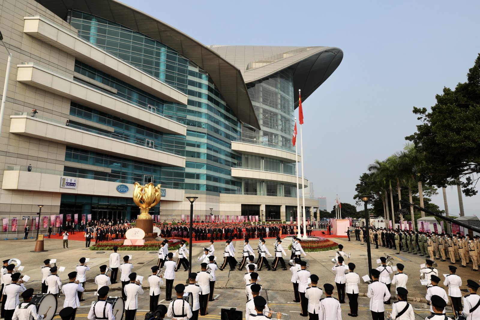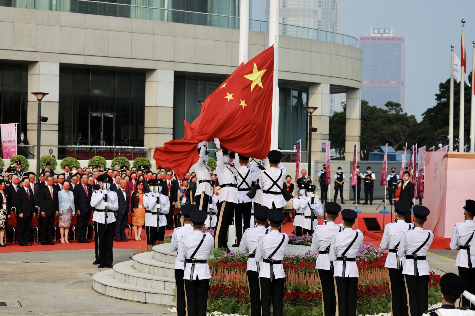 嘉賓戴上紅色口罩,今年同樣不設公眾席。警方飛行服務隊兩架直升機將會分別懸掛國旗及區旗,飛越維港上空,消防輪及水警輪則在會展對開海面進行水禮。