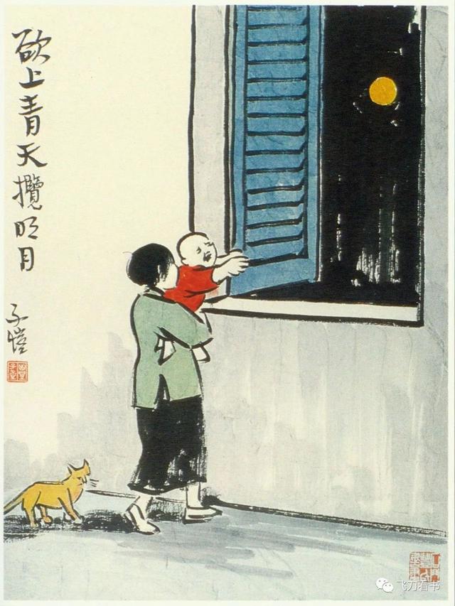 除了《中秋同樂會》,豐子愷有關中秋的創作其實還有不少。2018年是畫家誕辰120周年,在亞洲協會香港中心舉行的「當豐子愷邂逅竹久夢二」展覽上,我就見到了好幾幅以中秋為主題的作品真跡。樸實的文字,純真的畫風,在這些「花好月圓」的主題背後,折射出的是畫家對世間百態的溫柔與豁達。比如,一幅「欲上青天攬明月」的畫作,借用李白的豪邁詩句,畫的則是一個白白胖胖的孩童在母親懷裡伸出胖乎乎的小手,似乎想要摸一下窗外天空中的月亮。畫面溫馨,令人內心為之一暖。又如,作品「中秋之夜」描繪的是三代同堂、一家四口在月下漫步的其樂融融之景,然而其時卻正值戰火紛飛的抗戰年代。