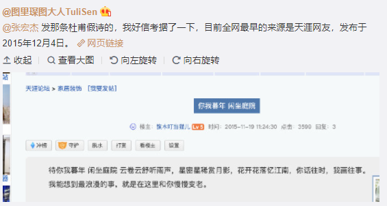 名人被「盜名」並不罕見,不過這次由於眾多平台同時轉發《暮年》,引起了歷史作家張宏傑的關注。他在微博上傳了多張截圖,並指「杜甫想不到身後會有這樣一劫。」才引發了公眾對詩作真偽的關注。